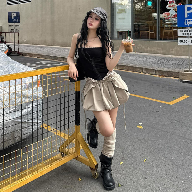 排扣挂脖吊带背心蓬蓬短裙套装女