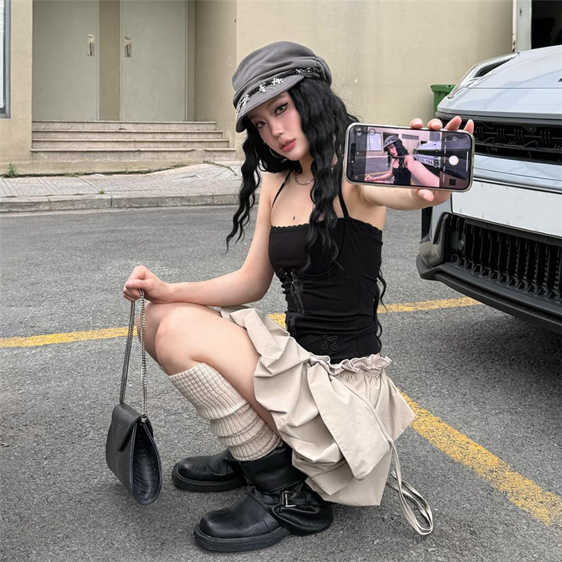 #Sisjuly#梦核千禧蕾丝拼接排扣挂脖吊带背心 焦糖蓬蓬短裙套装女