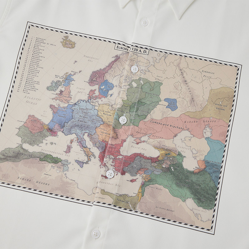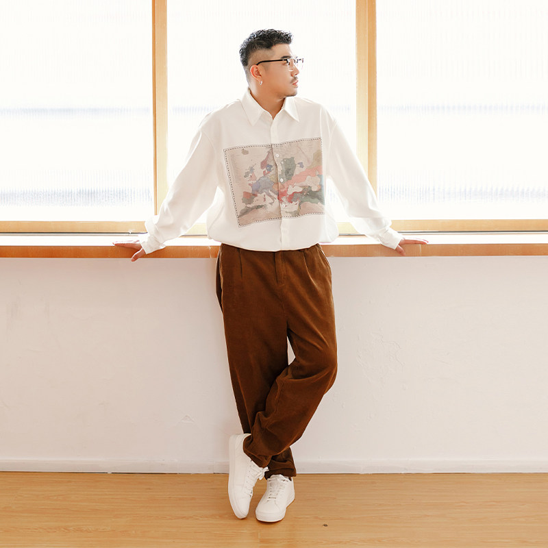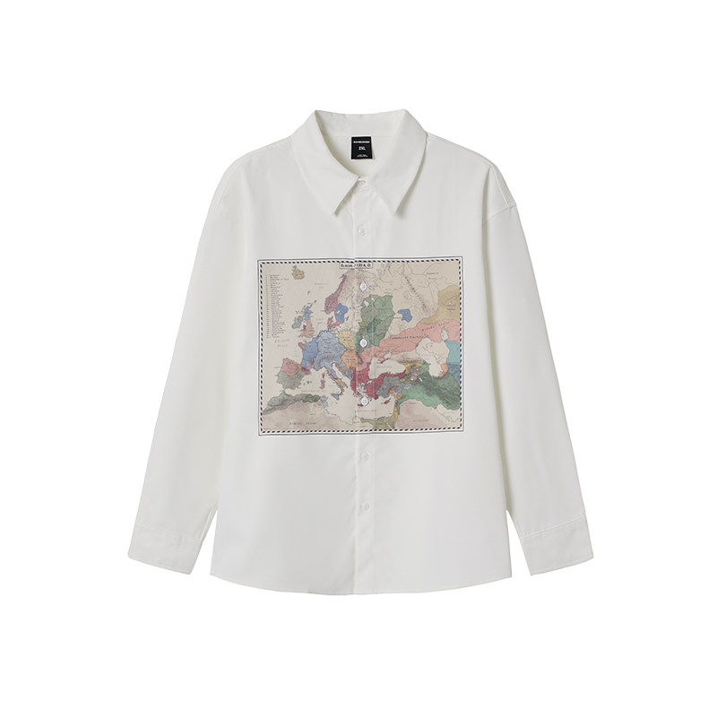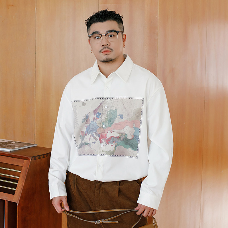 韦恩泽维尔大码休闲商务衬衫男长袖宽松秋季复古印花白色衬衣8743