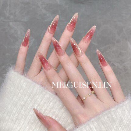 玫瑰森林迷雾甜桃手工穿戴甲2026年新款红色渐变长款法式猫眼美甲