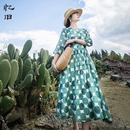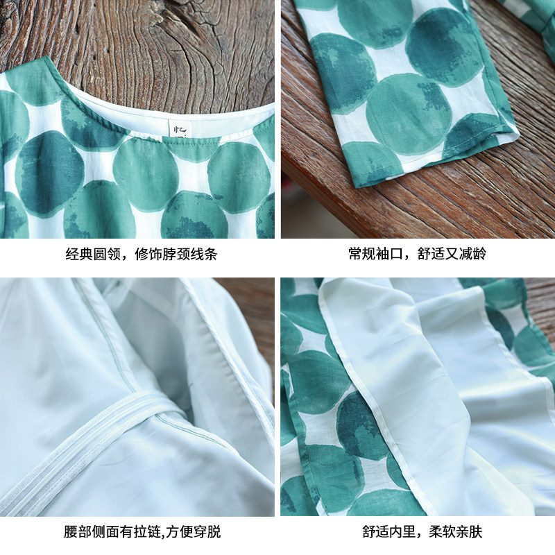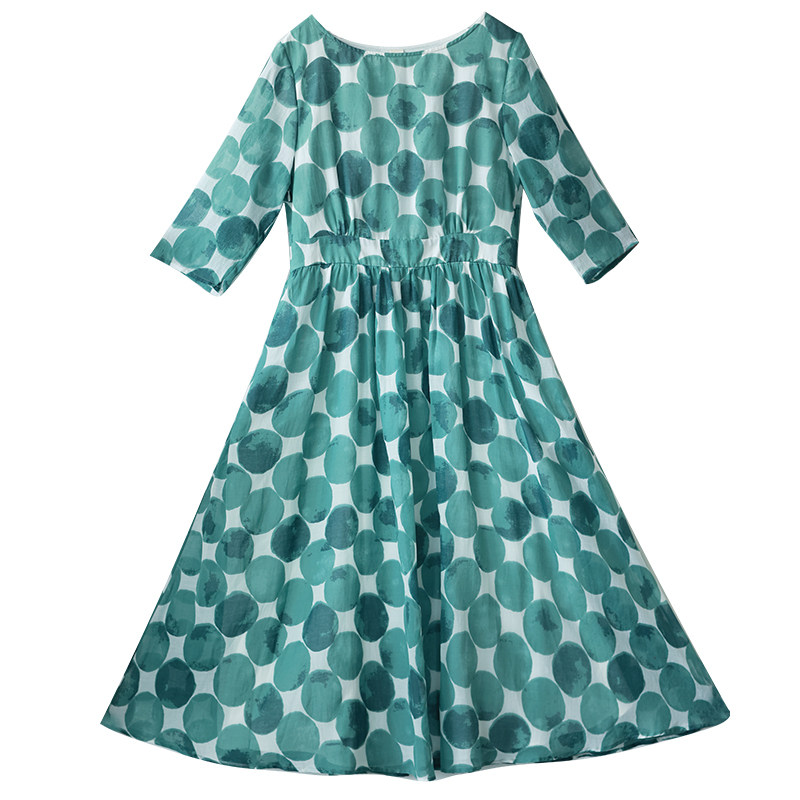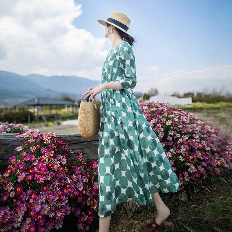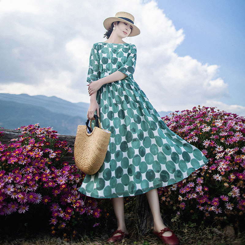 5折【淡若清风】高腰波点大摆型连衣裙女圆领春季七分袖印花长裙