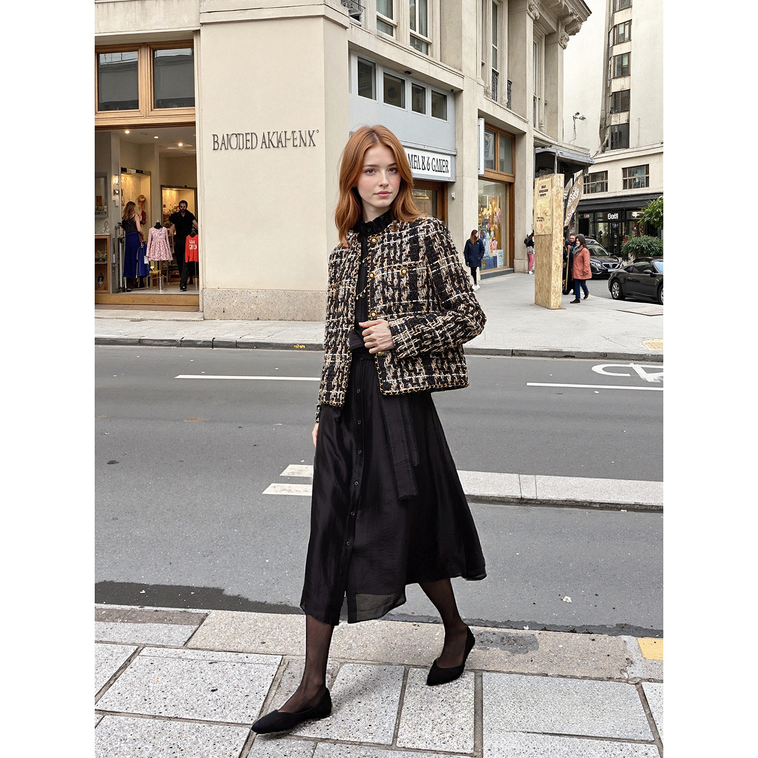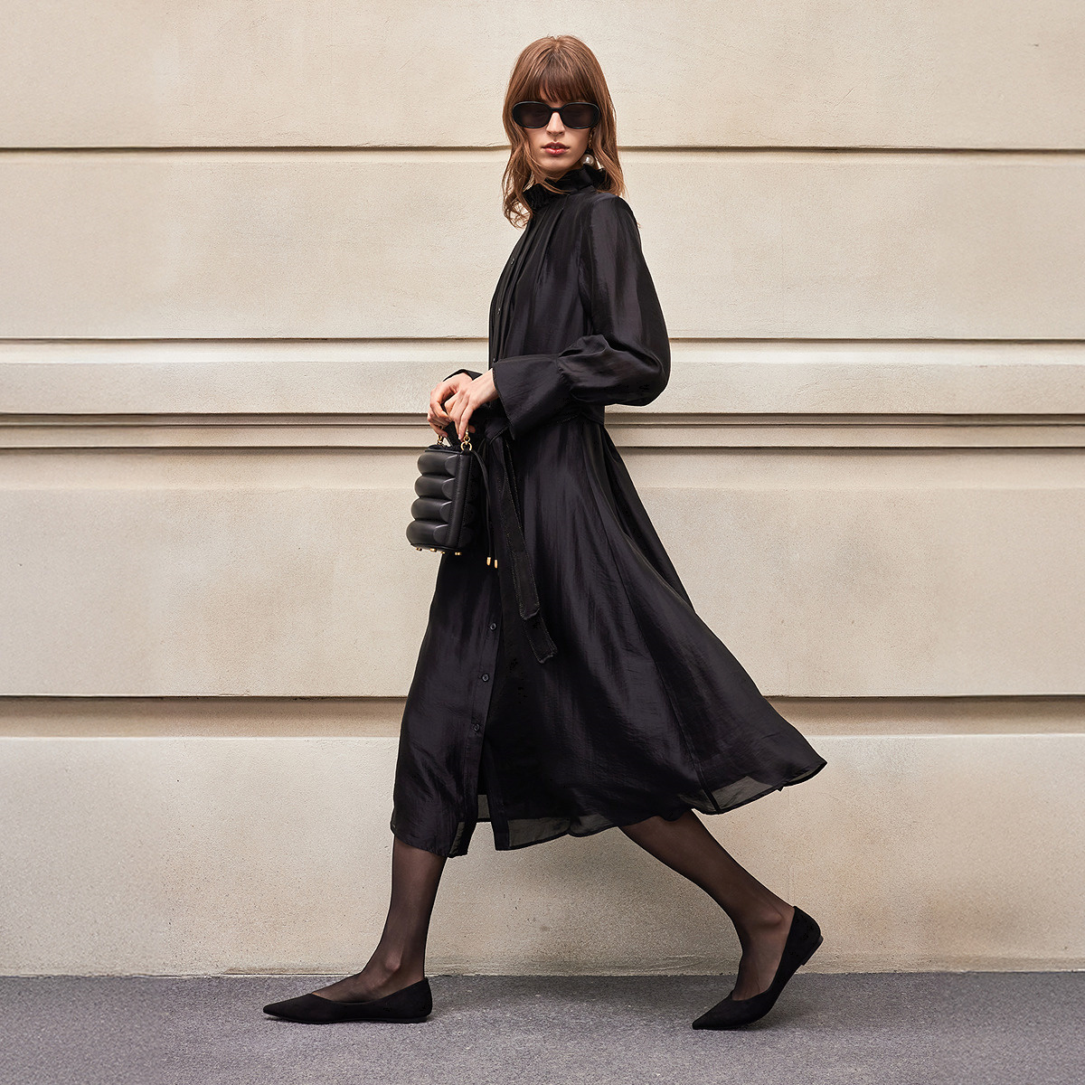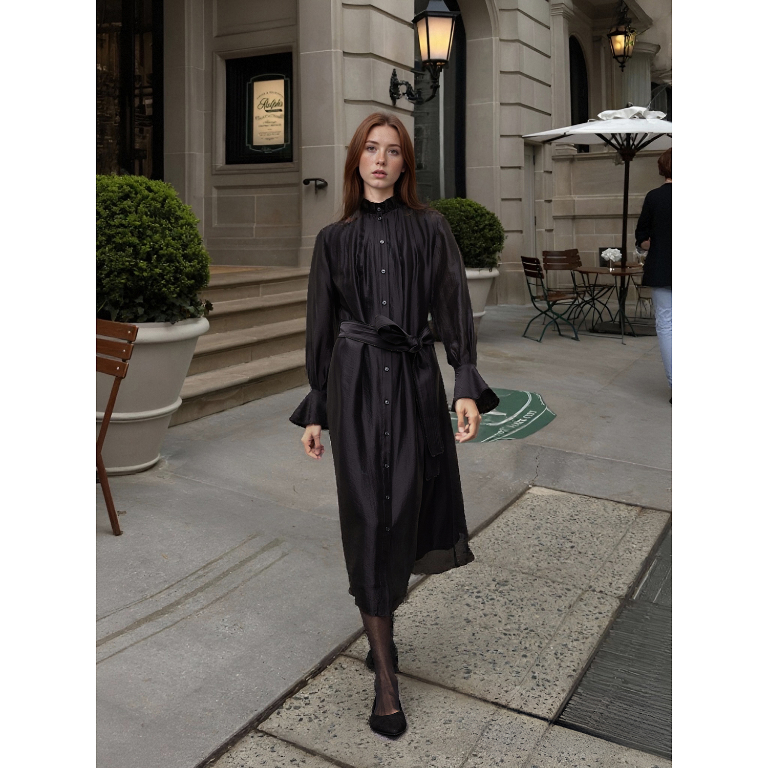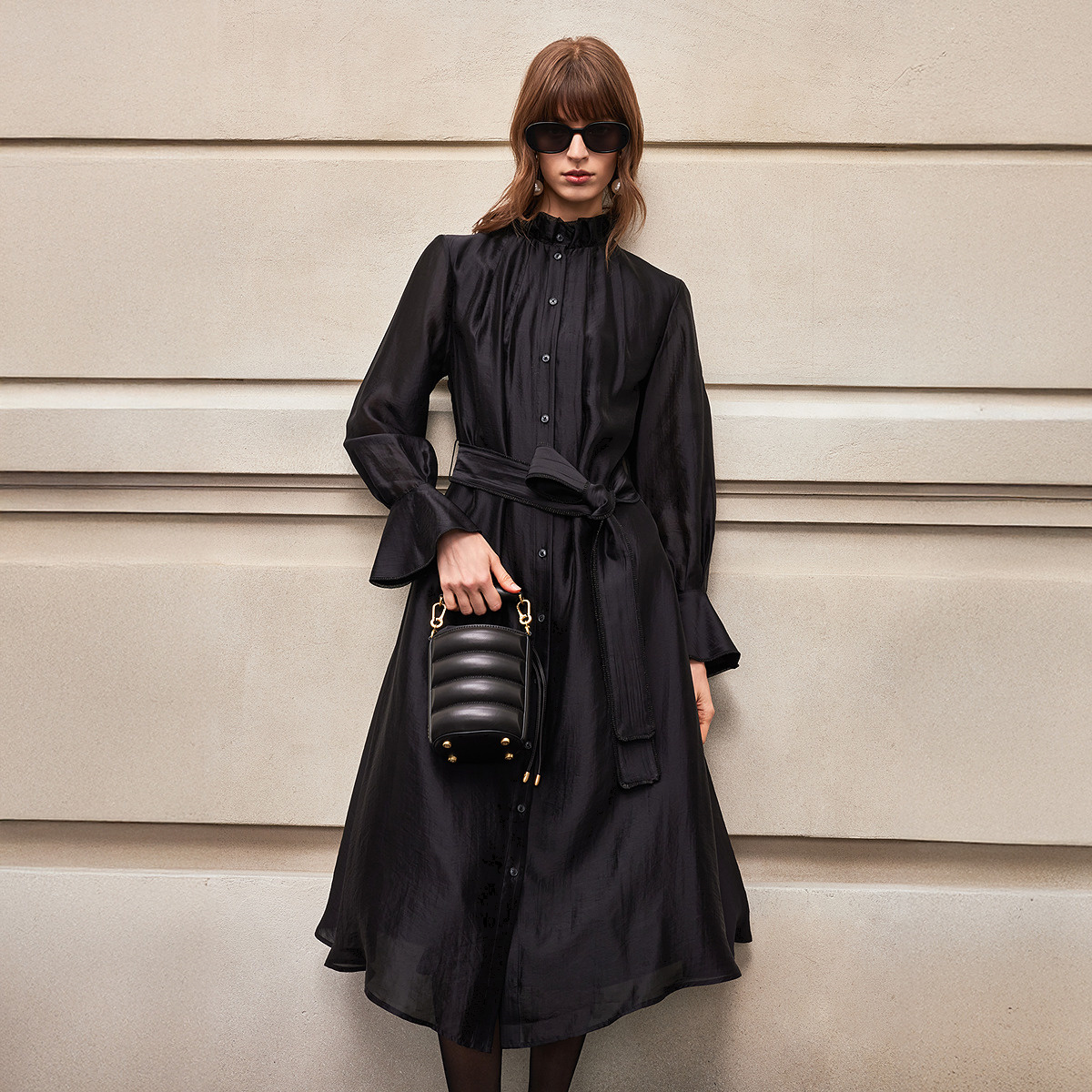BCBG25早秋新款精致时尚花边立领荷叶边长袖系带女士长款连衣裙