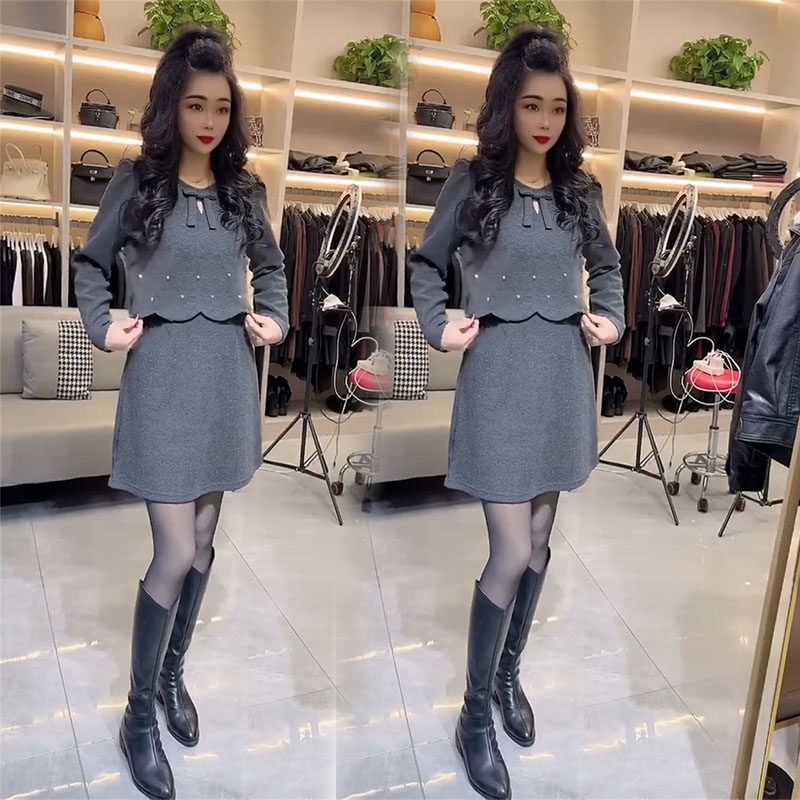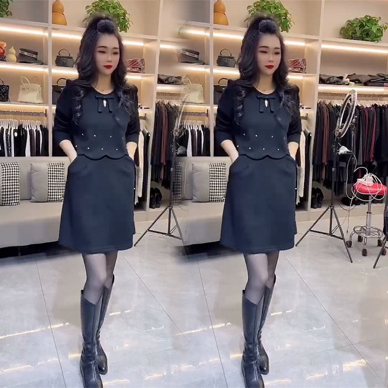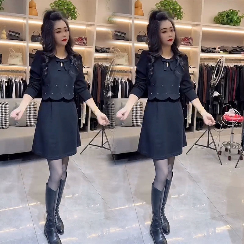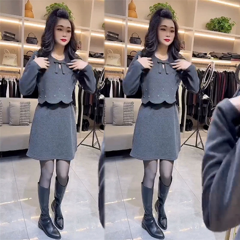 小香风珍珠装饰假两件连衣裙女2025冬不规则蝴蝶结千金风显瘦短裙