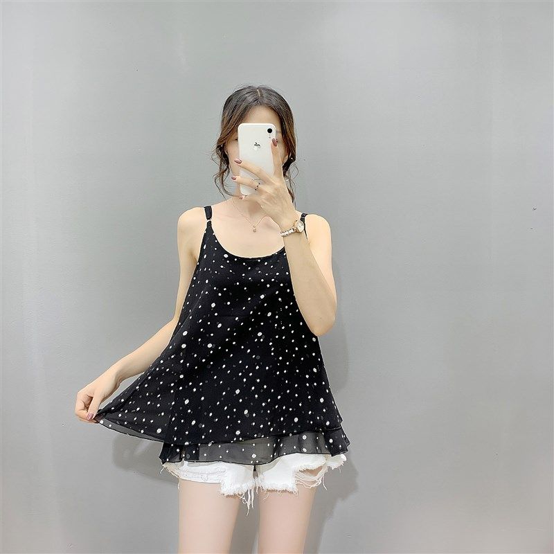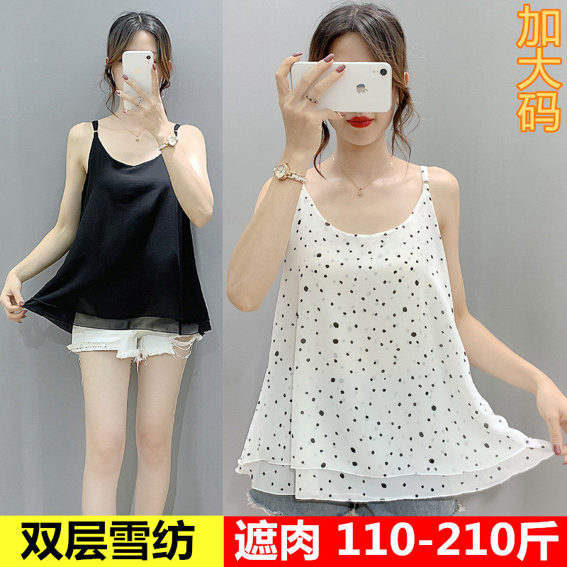 夏季双层雪纺吊带背心女遮肚200斤胖mm加肥加大可调节打底雪纺衫