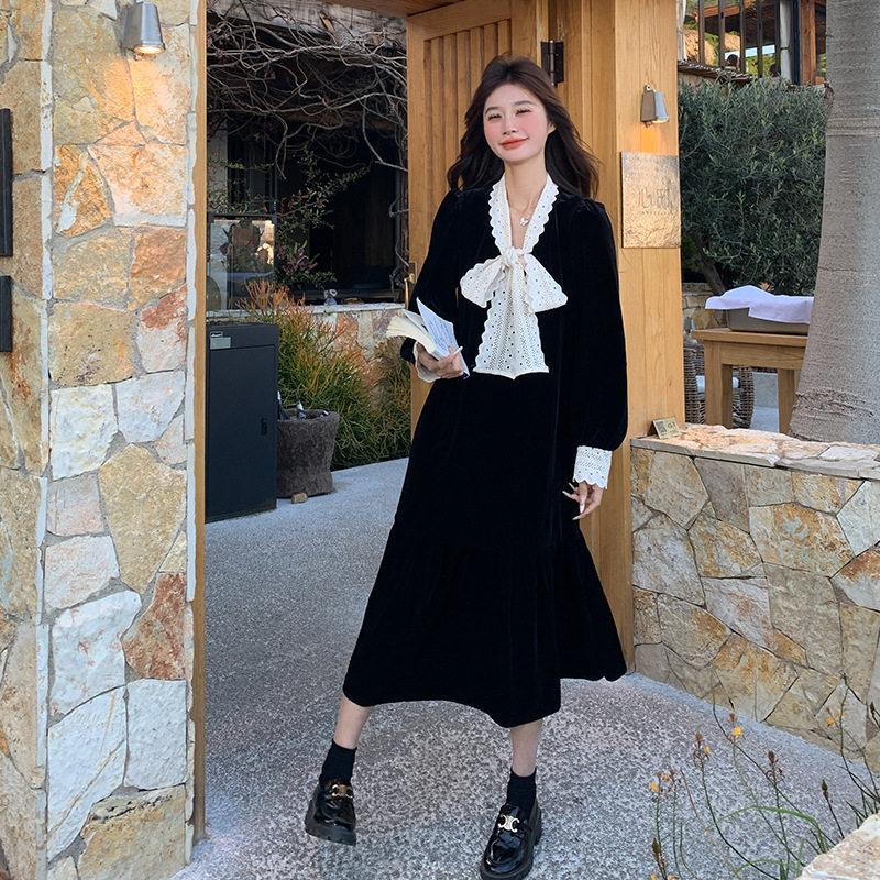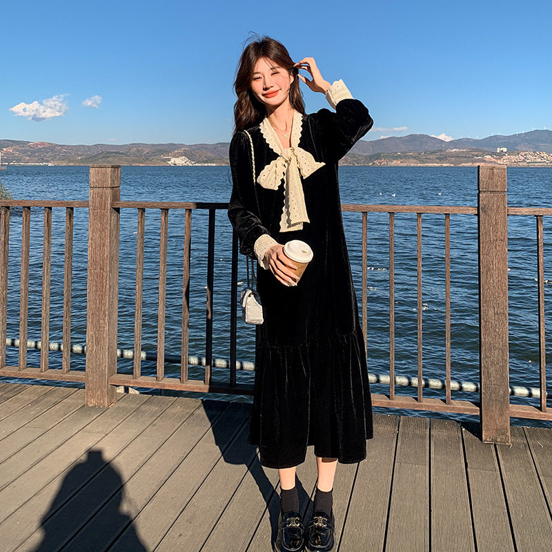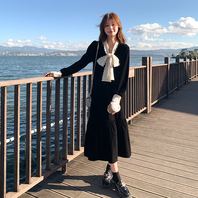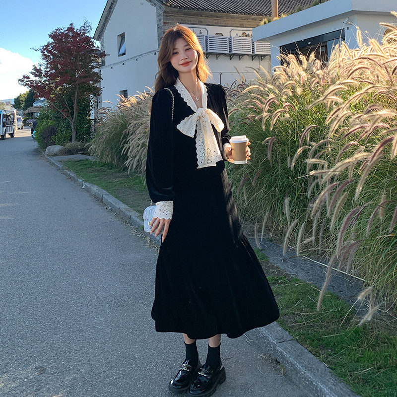 罗芬 故事面料女装官方实拍法式复古赫本风丝绒连衣裙2025新款蕾
