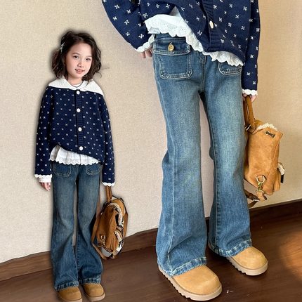 女一体绒牛仔喇叭裤儿童外穿弹力洋气裤子童装直筒加绒秋冬款裤子