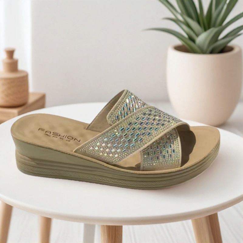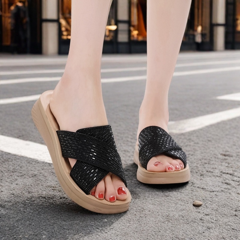 2025新款水钻妈妈拖鞋夏季防滑软底半拖平底拖沙滩老人凉拖女坡跟