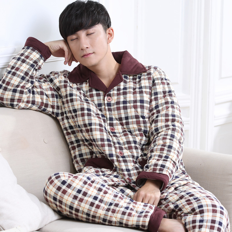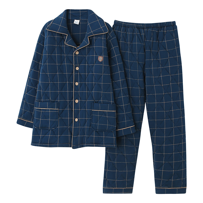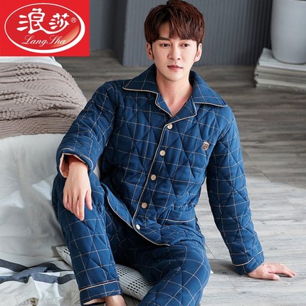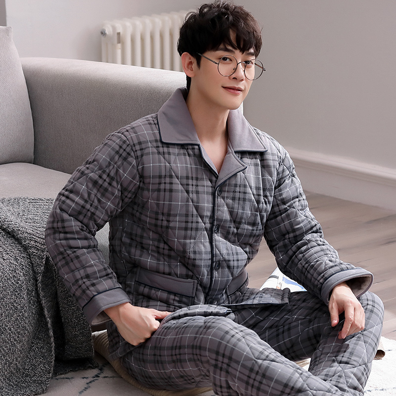 冬季男士睡衣秋冬款纯棉三层夹棉加厚加棉保暖中年爸爸家居服套装