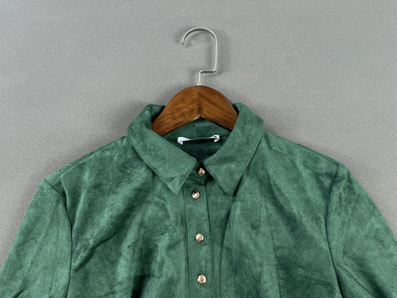 原 波兰单 绿色麂皮绒A字衬衫裙腰带收腰中长款显瘦长袖连衣裙女