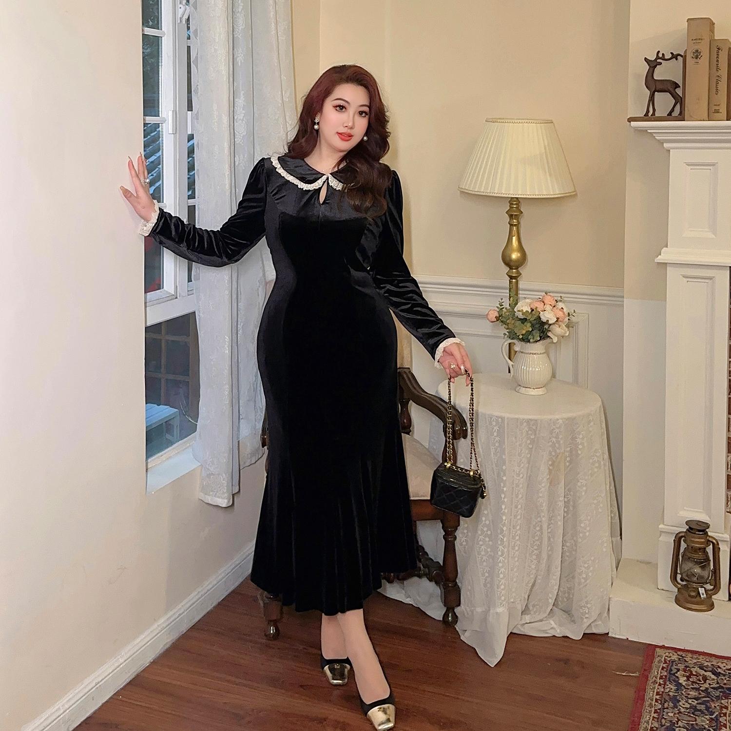 GLEC大码女装2025秋冬新款法式蕾丝花边丝绒高级感镂空鱼尾连衣裙