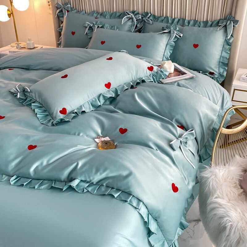 简约婚庆四件套纯棉60支长绒棉爱心刺绣红色O结婚花边被套床单床