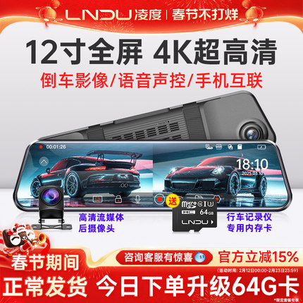 凌度12寸全屏行车记录仪超高清夜视流媒体后视镜倒车影像2026新款