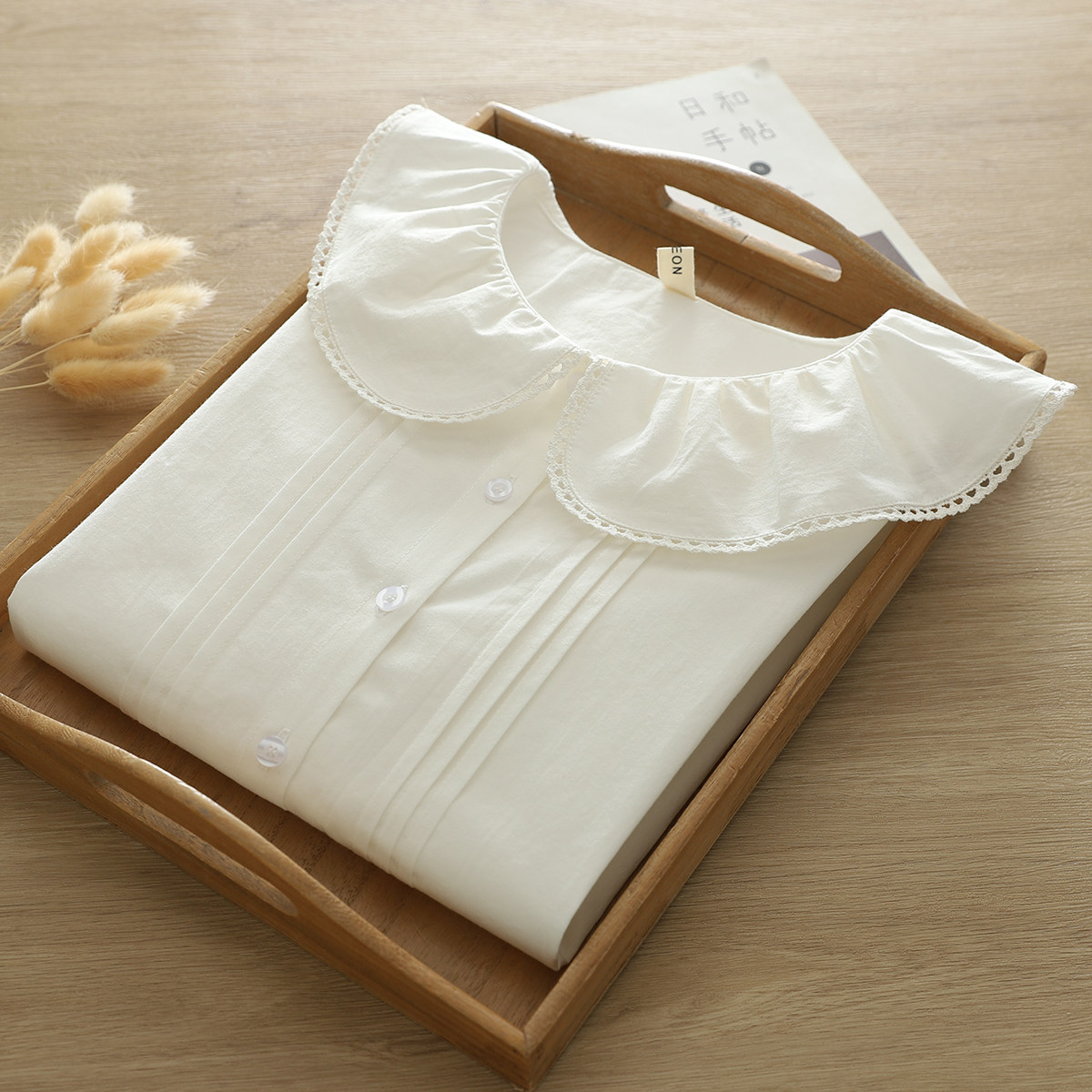 小清新日系风琴褶皱娃娃领纯棉白衬衫女长袖学生甜美文艺宽松衬衣