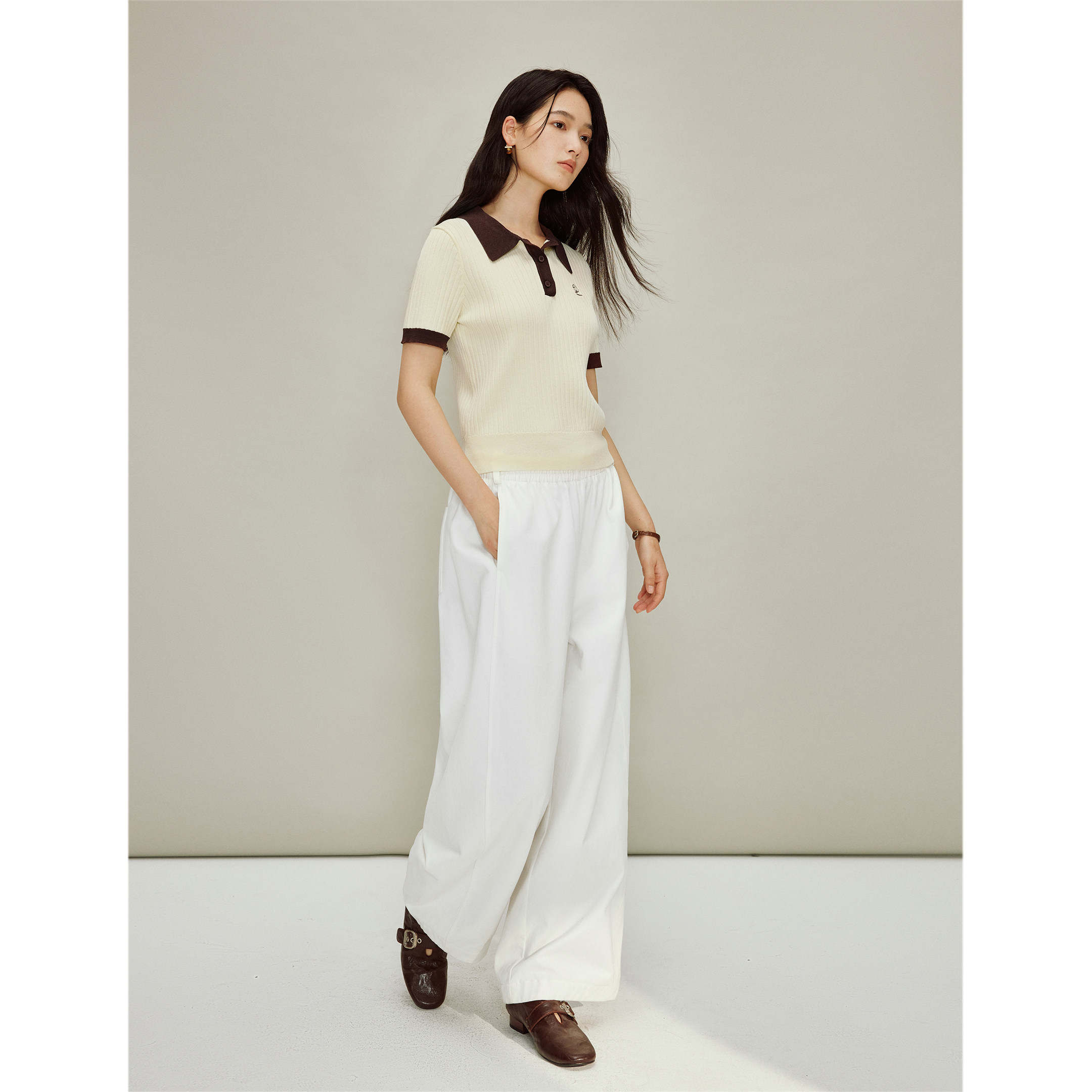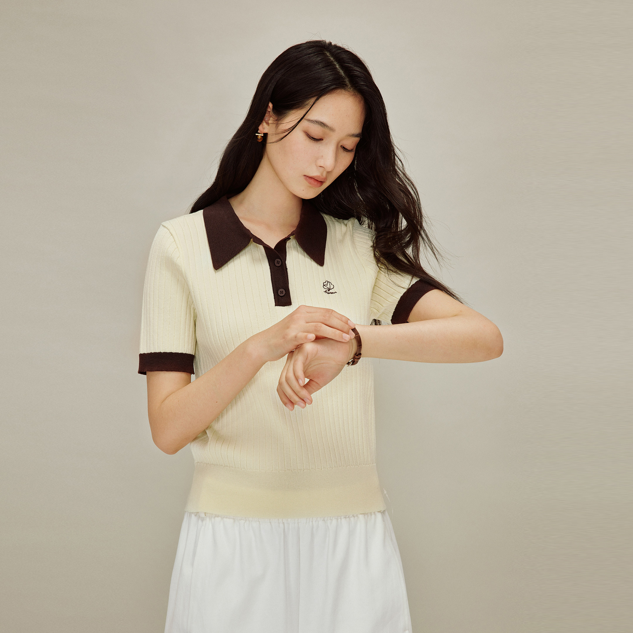 茵曼POLO领撞色简约针织衫2026春季女装新款百搭显瘦短袖套头上衣