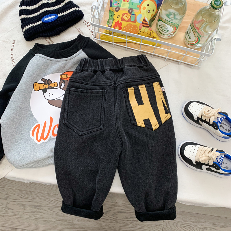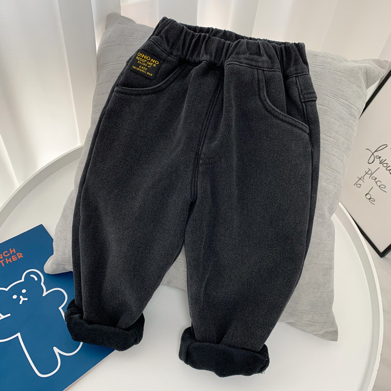 男童加绒裤子洋气小童冬季加厚一体绒牛仔裤儿童韩版弹力老爹裤潮