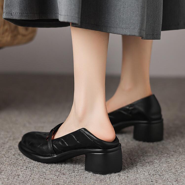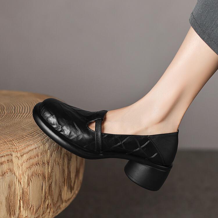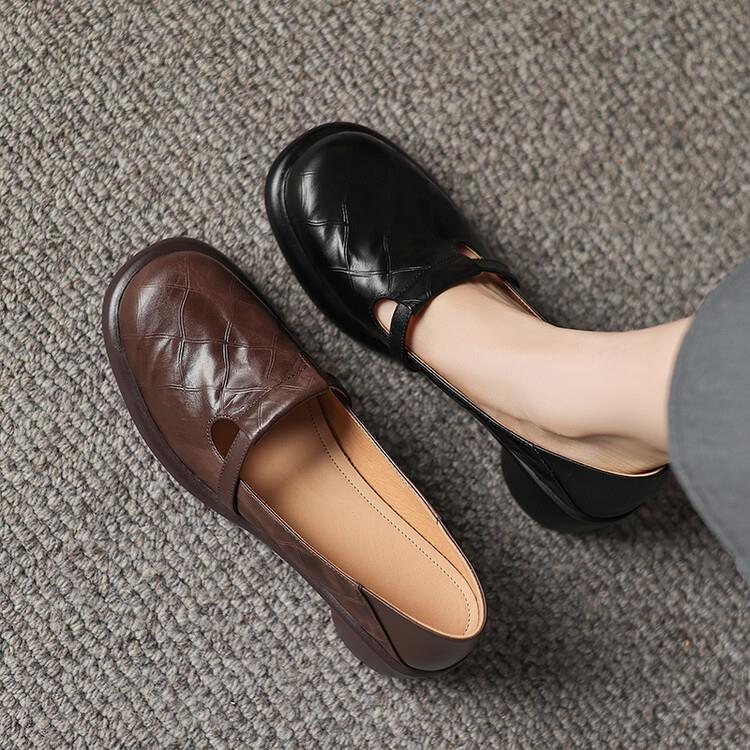 巨好穿法式单鞋女春秋季浅口圆头中跟粗跟真皮高跟软底33码40棕色