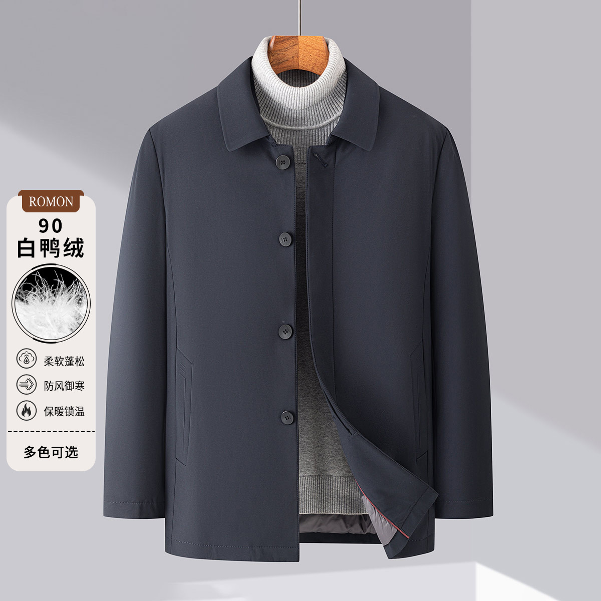 90白鸭绒 可脱卸内胆】罗蒙秋冬男士翻领羽绒服外套爸爸装羽绒服