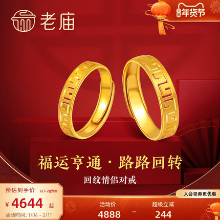 老庙足金黄金5G金工艺回字万字情侣开口对戒戒指男款官方正品礼