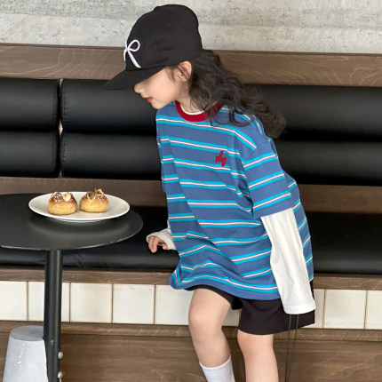女童长袖T恤2025早春新款儿童洋气上衣撞色条纹宽松假两件打底衫