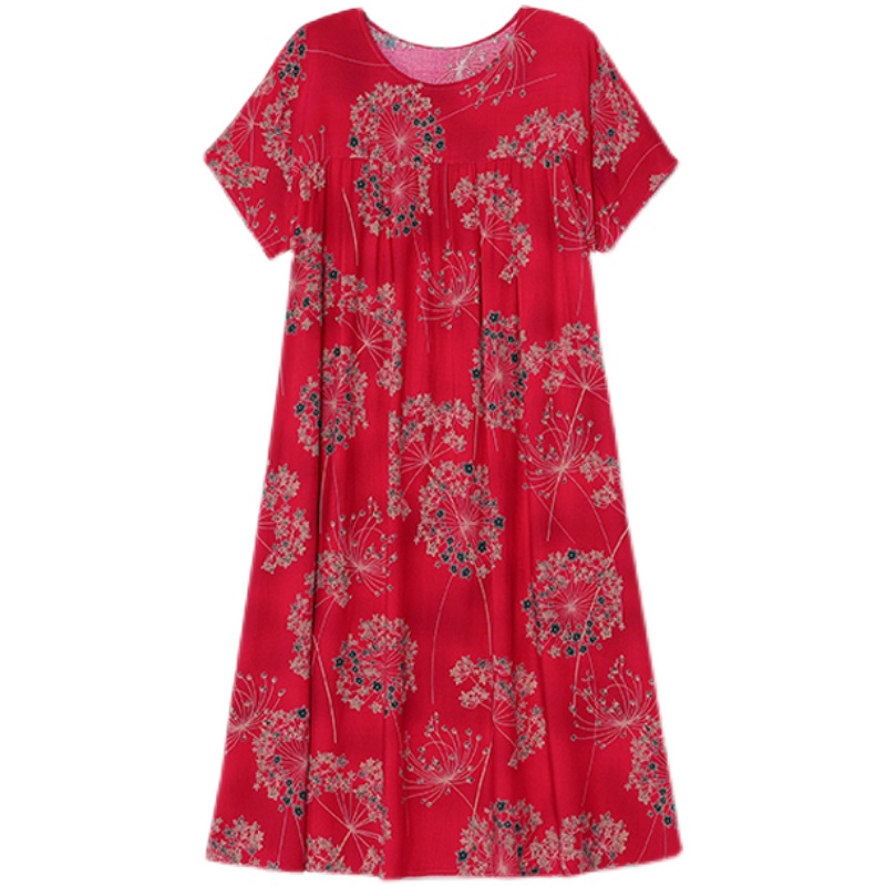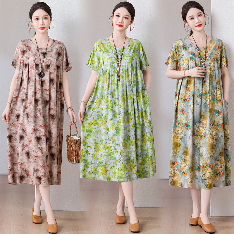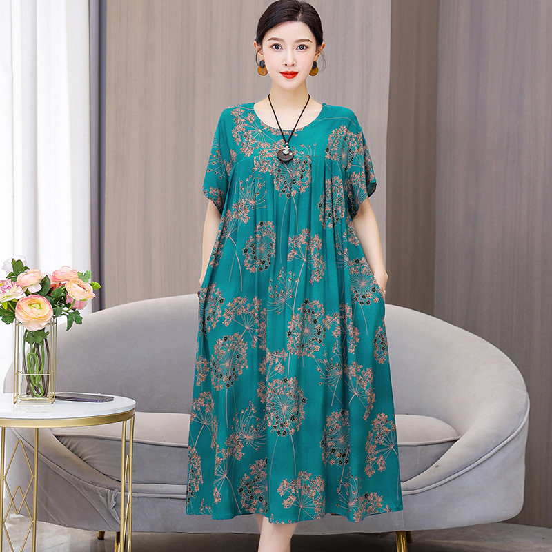 大码妈妈装加肥加大夏季中老年棉绸连衣裙休闲短袖中长款碎花裙