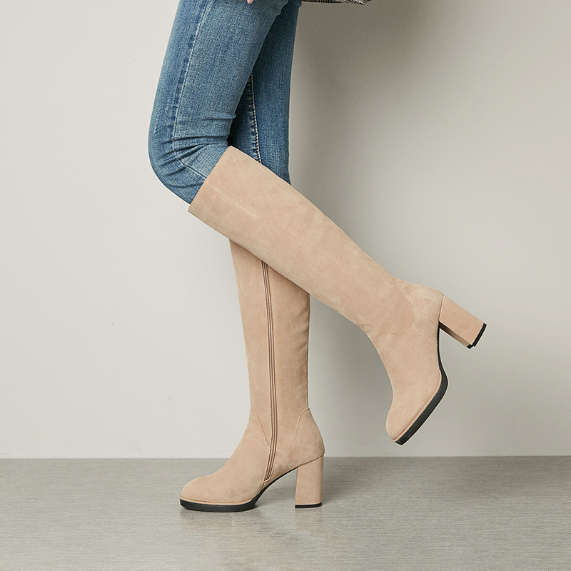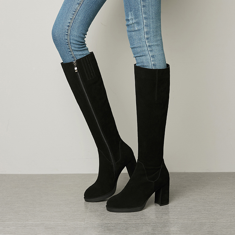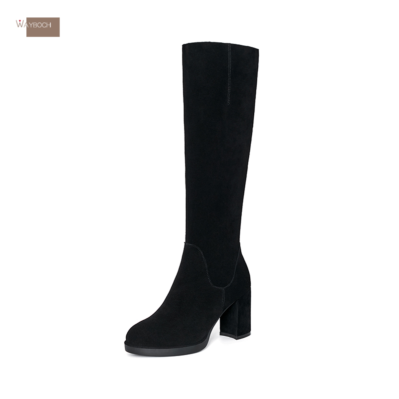 way全皮长靴子!真皮磨砂防水台高筒靴高跟粗跟圆头骑士靴冬女式
