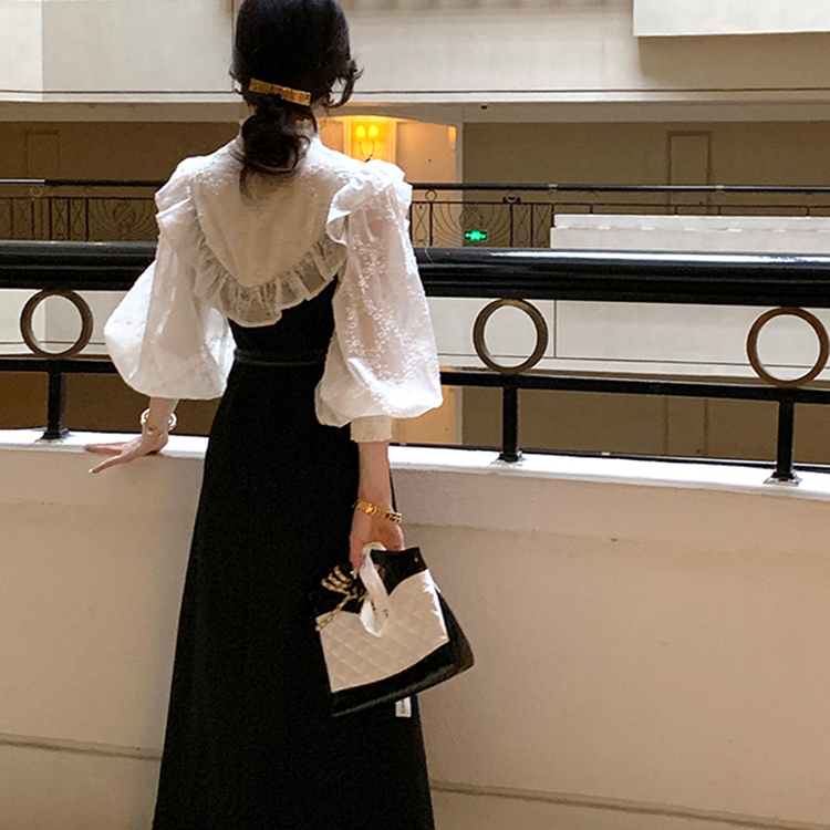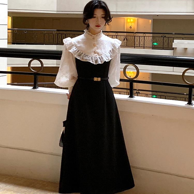 法式复古风黑白拼接蕾丝长袖连衣裙女早秋新款收腰显瘦气质长裙子