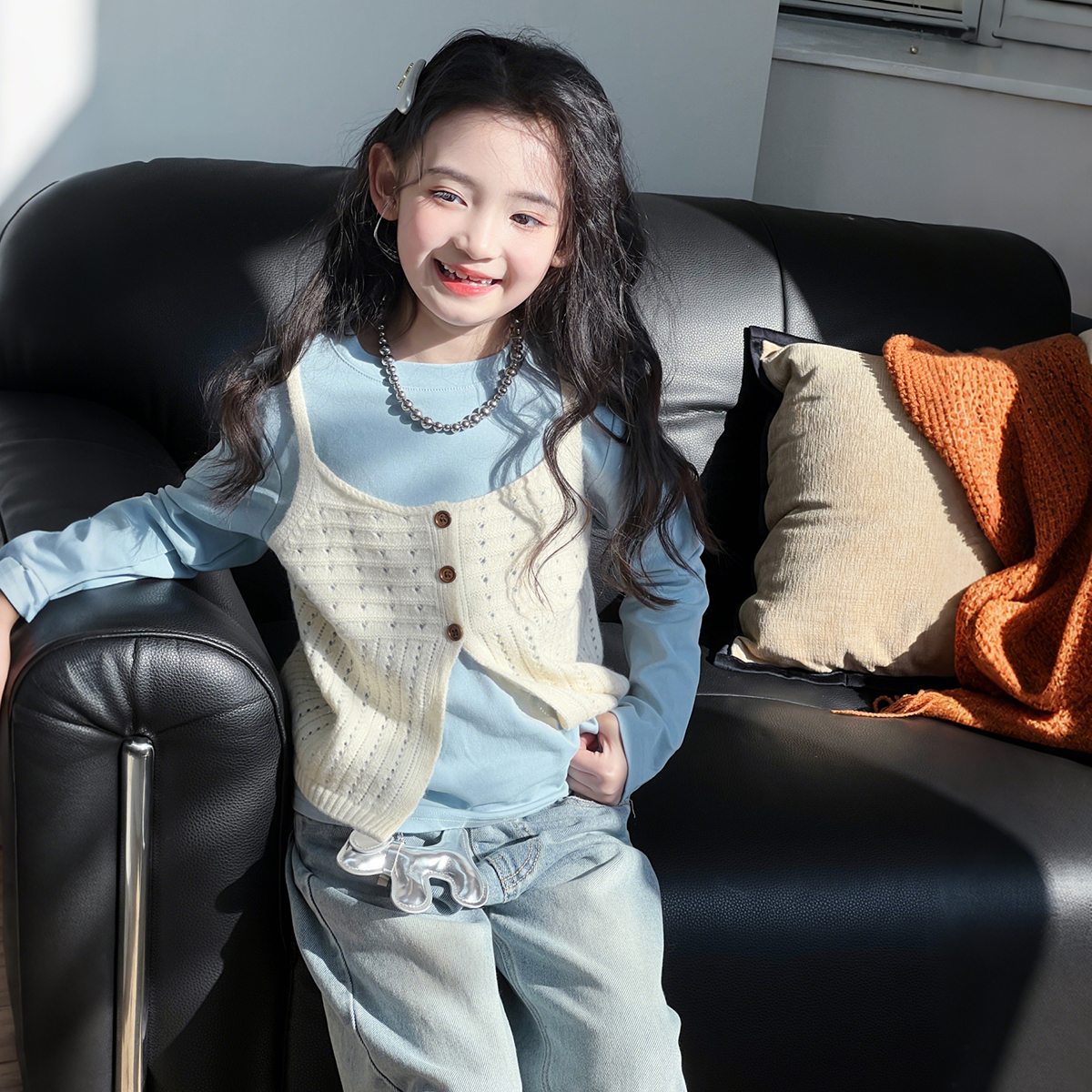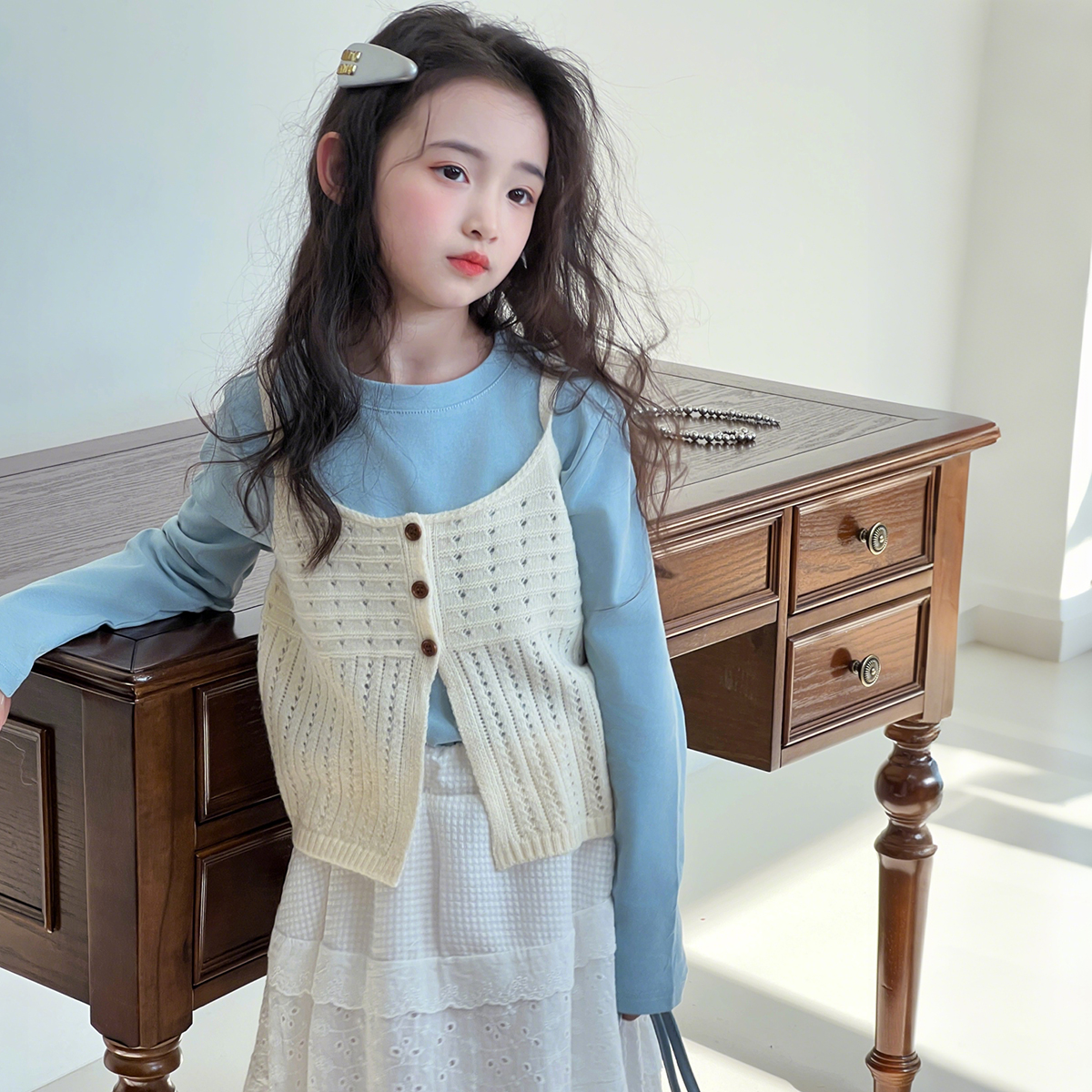 女童套装2025秋季新款儿童韩版针织背心洋气马甲打底衫叠穿两件套