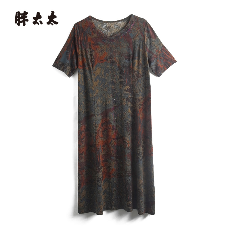 胖太太大码女装夏新款V领妈妈装显瘦中长连衣裙825220540