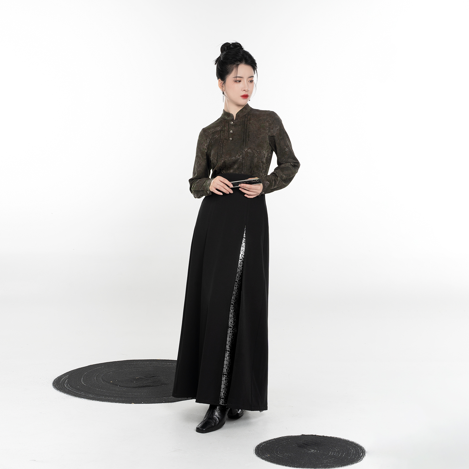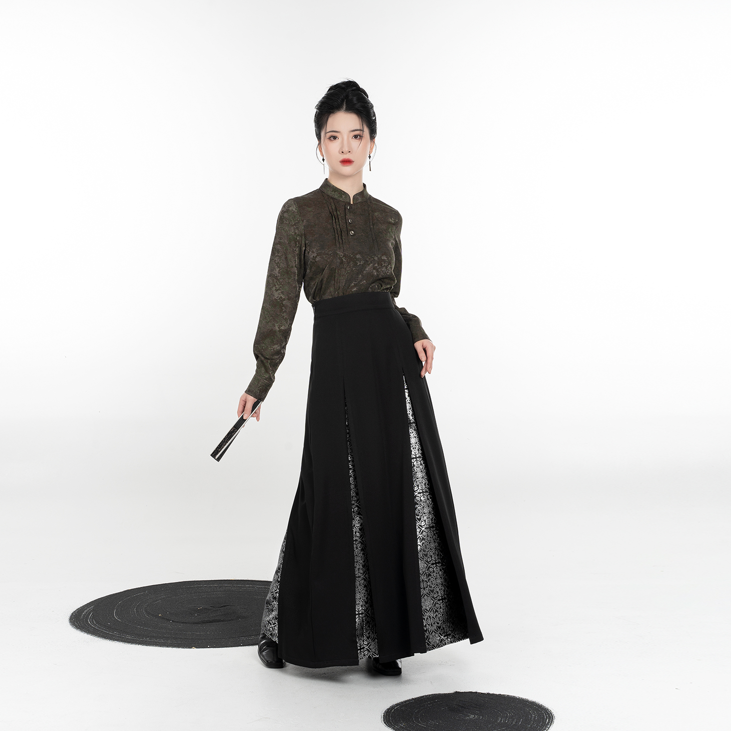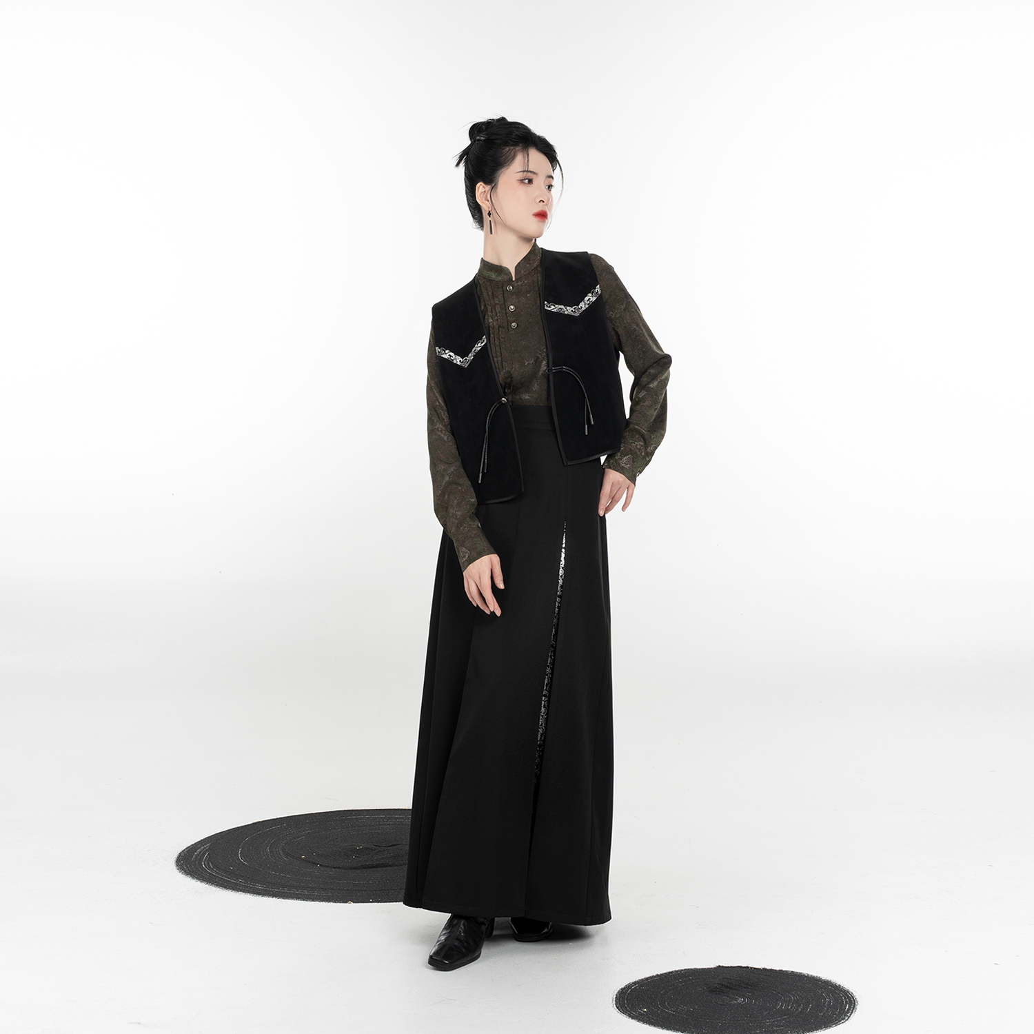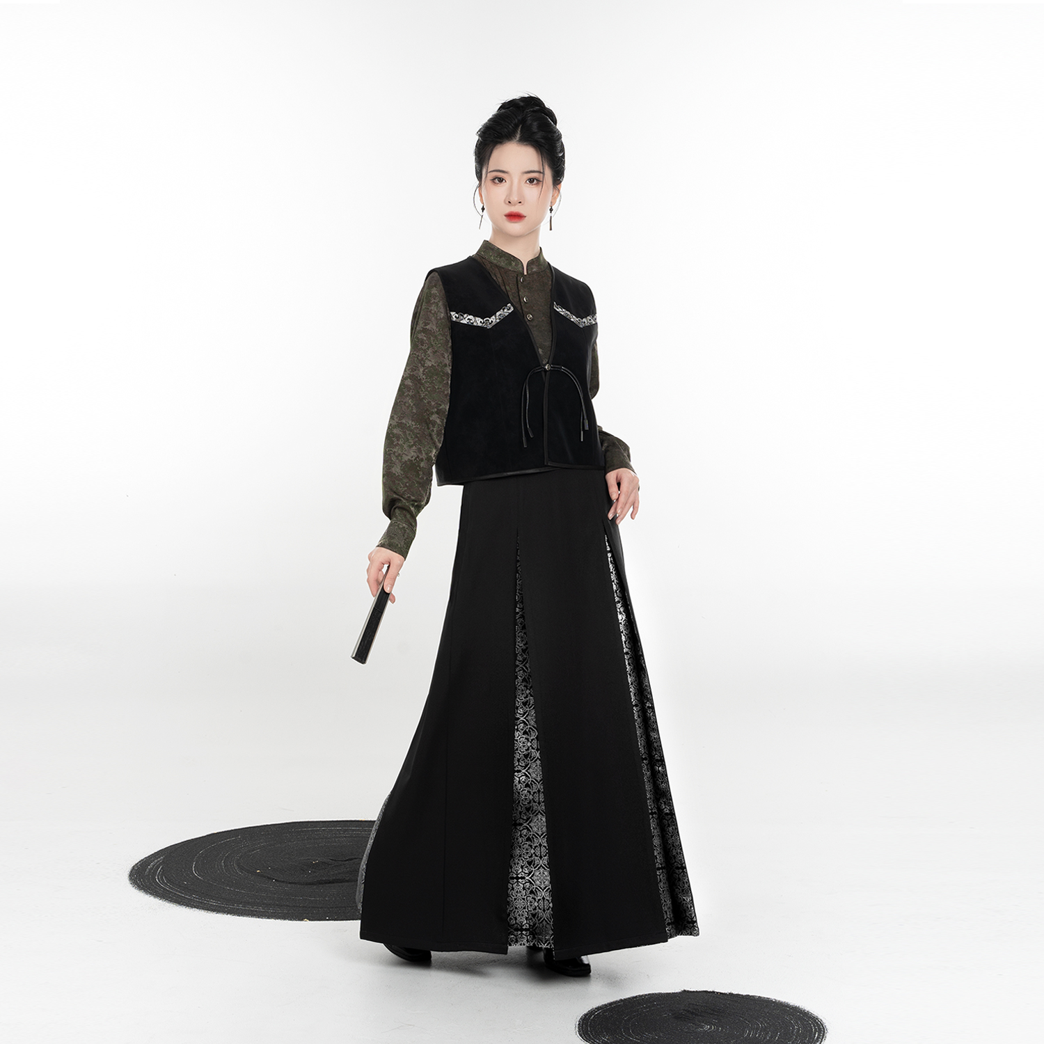织造司[霜夜]新中式两件套盘扣流苏v领马甲国风绣花立领长袖衬衫