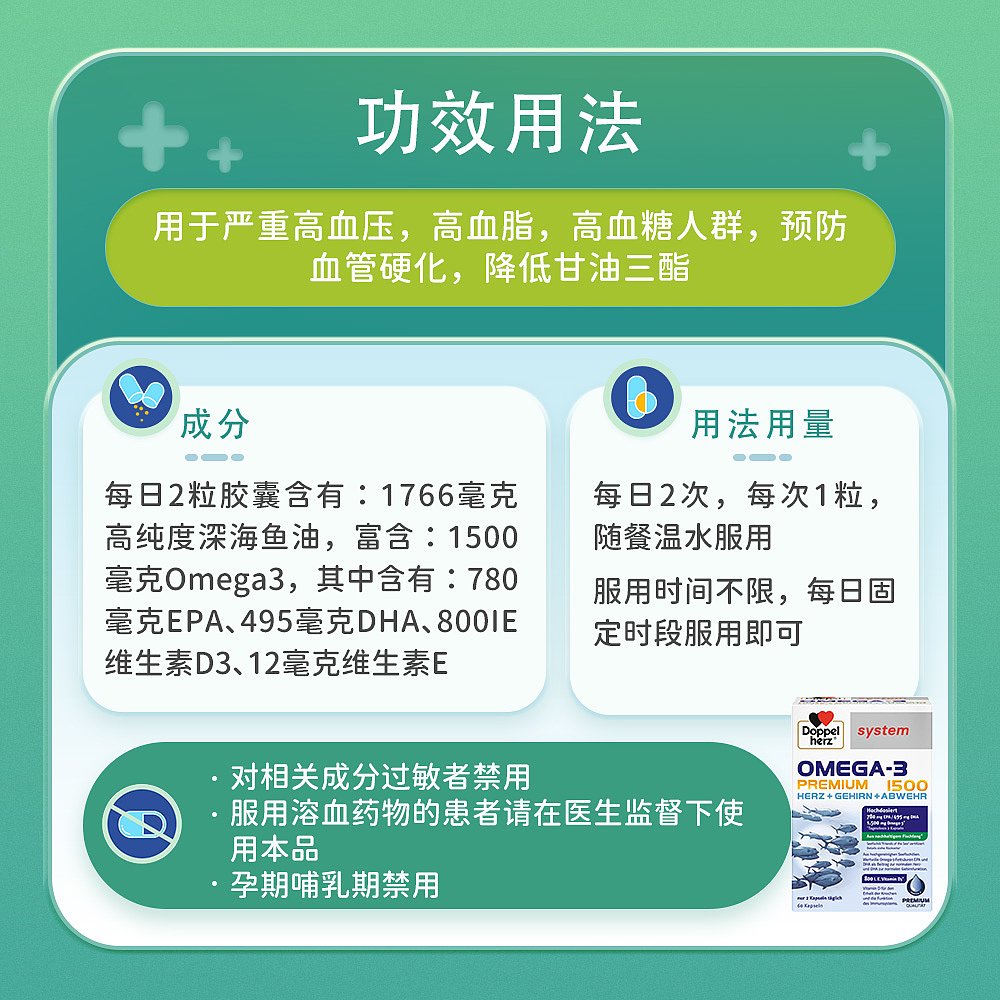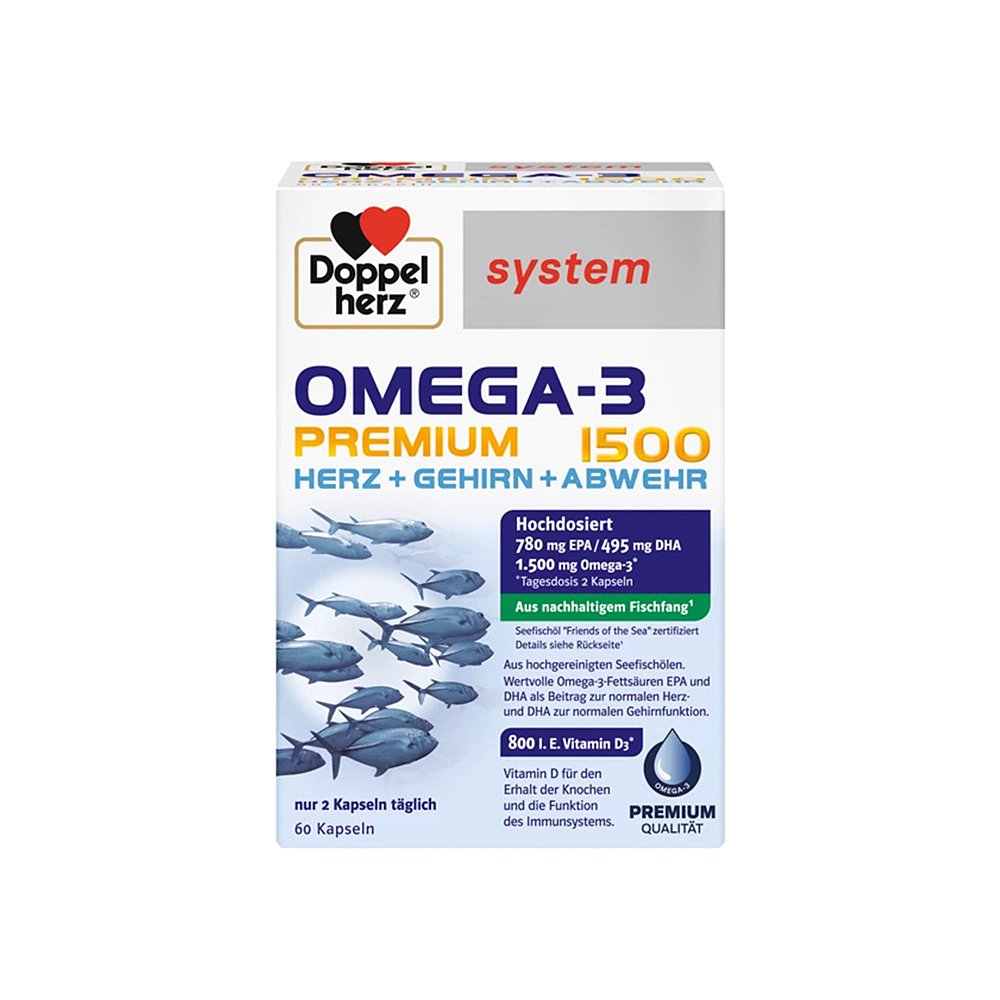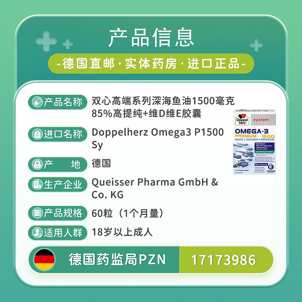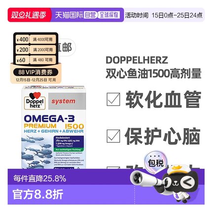 欧洲直邮德国药房Doppelherz双心Omega3胶囊60粒深海鱼油护心脑