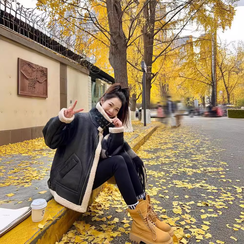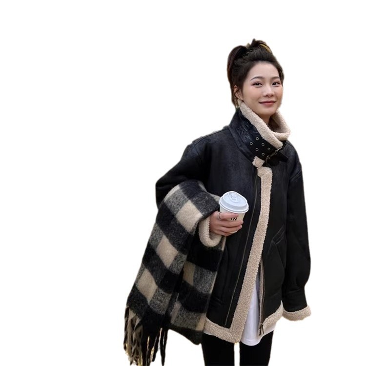 皮毛一体羊羔毛外套女2025新款冬季麂皮绒机车服夹克羊羔绒棉服