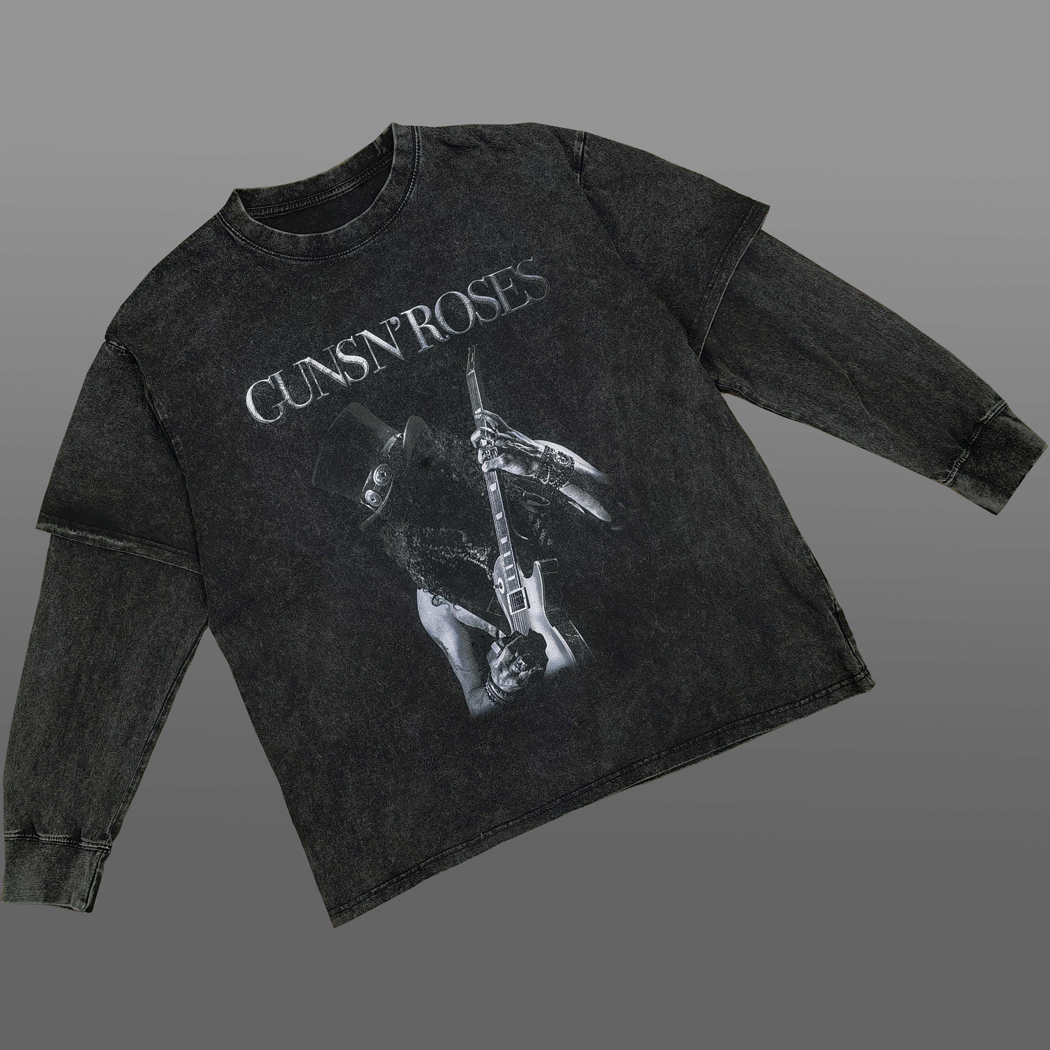 水洗做旧枪花摇滚乐队假两件长袖