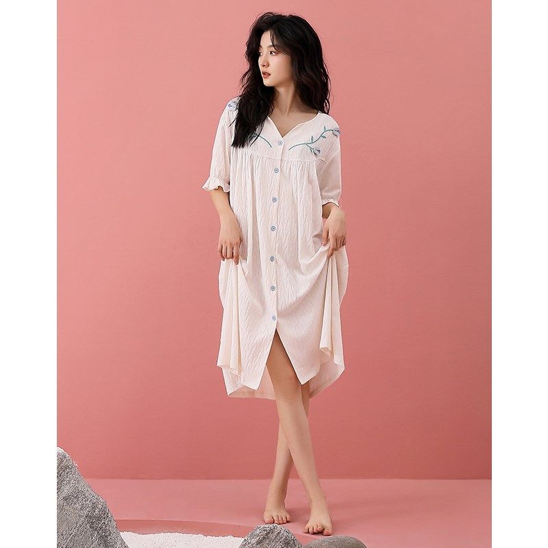 2024新款睡裙女夏季纯棉短袖白色甜美宽松孕妇家居服夏天开衫睡衣