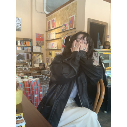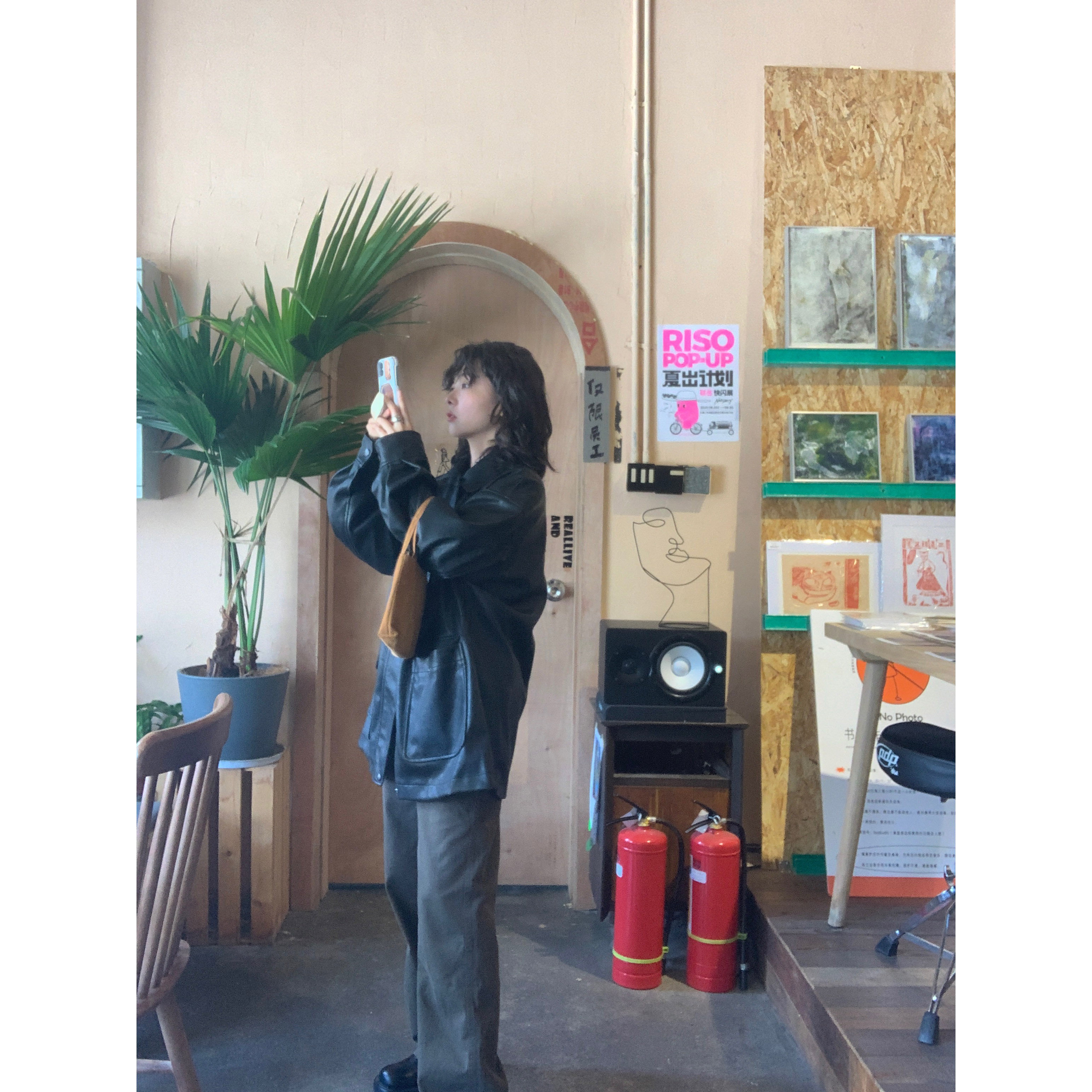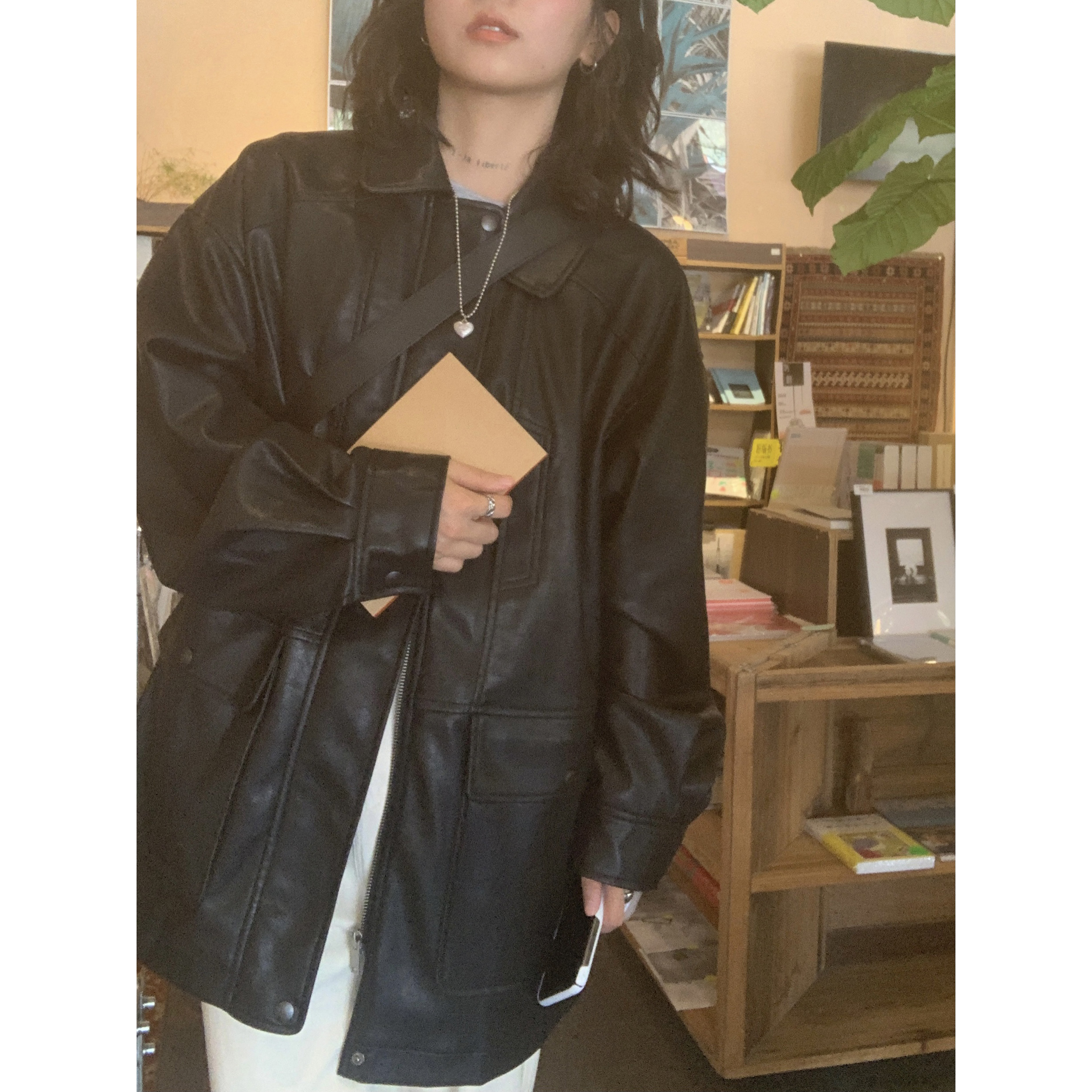 ifbeer古着感黑色皮衣外套中长款复古宽松西装上衣女ins韩秋冬