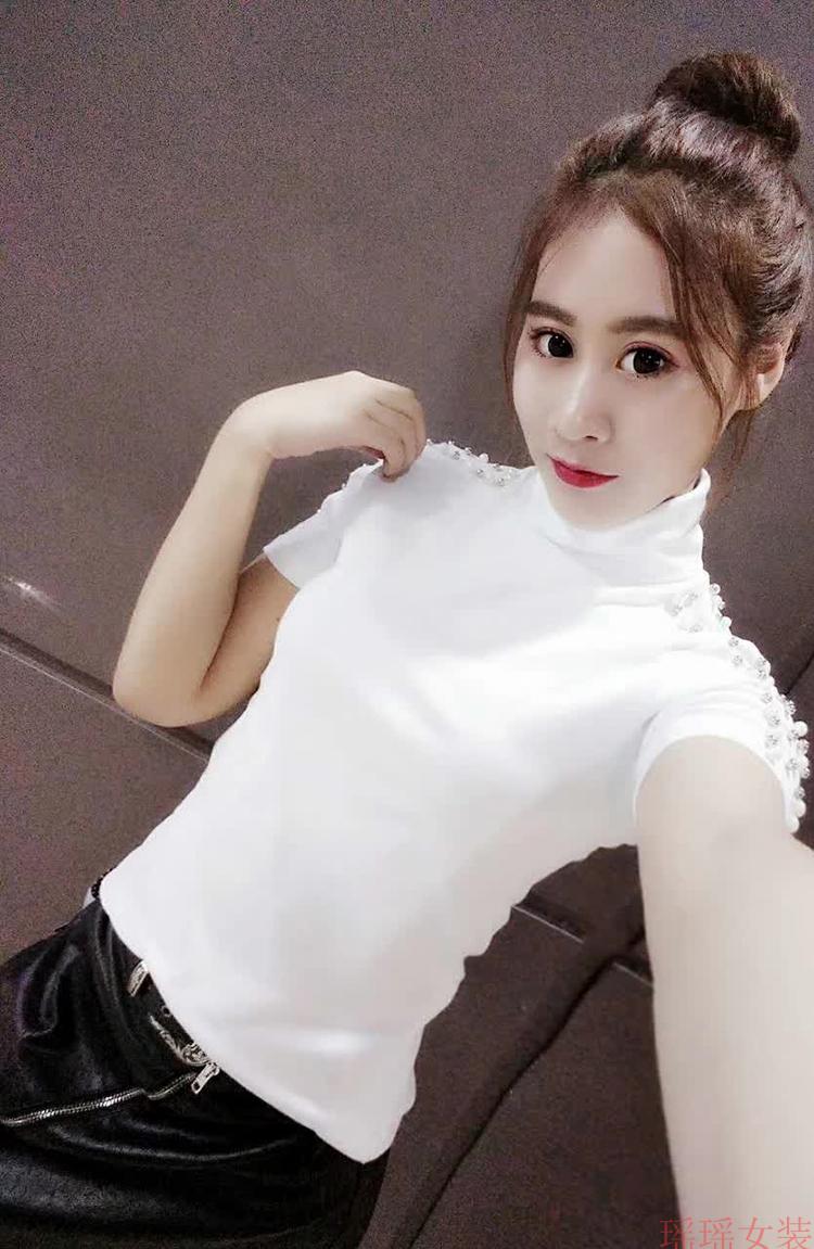 秋季打底衫女2024新款短袖T恤钉珠套头短款上衣百搭修身高领时尚