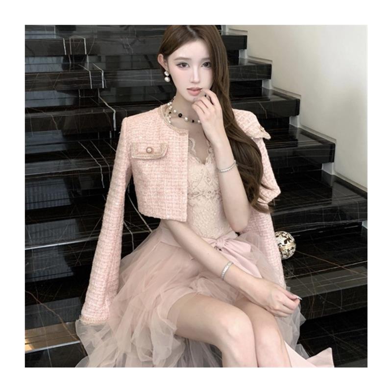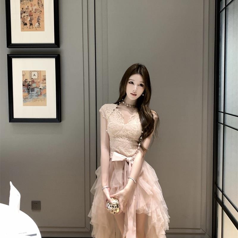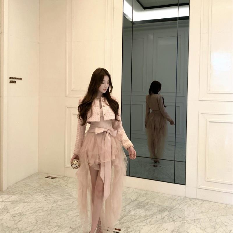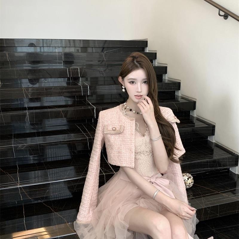 法式富家千金小香风套装女高级感气质不规则蕾丝网纱连衣裙两件套