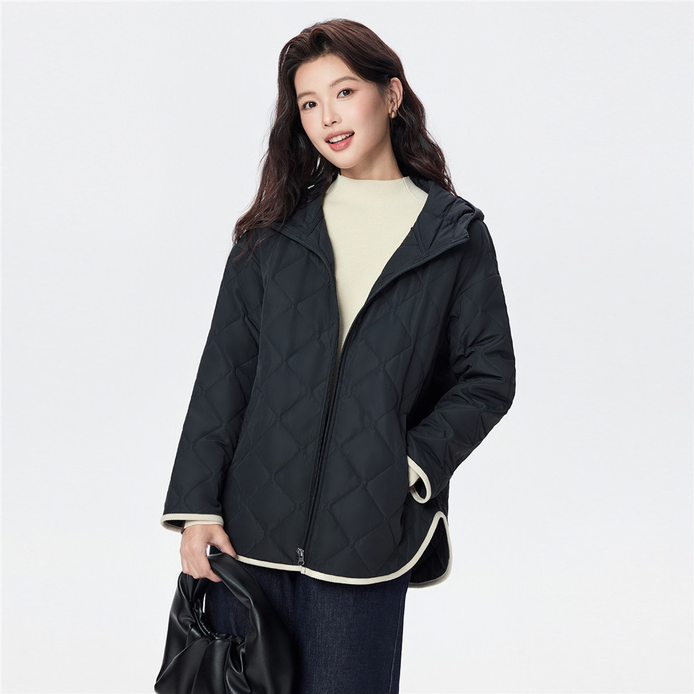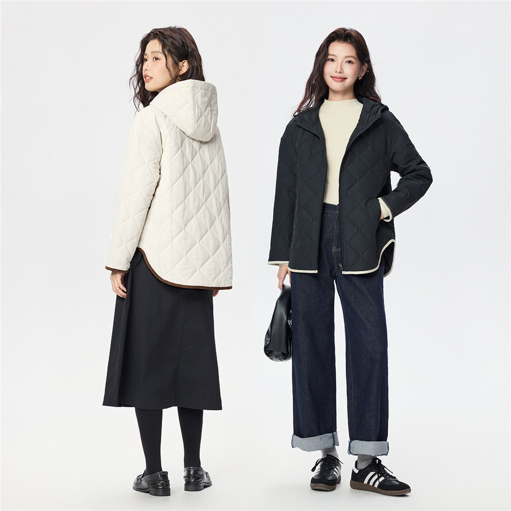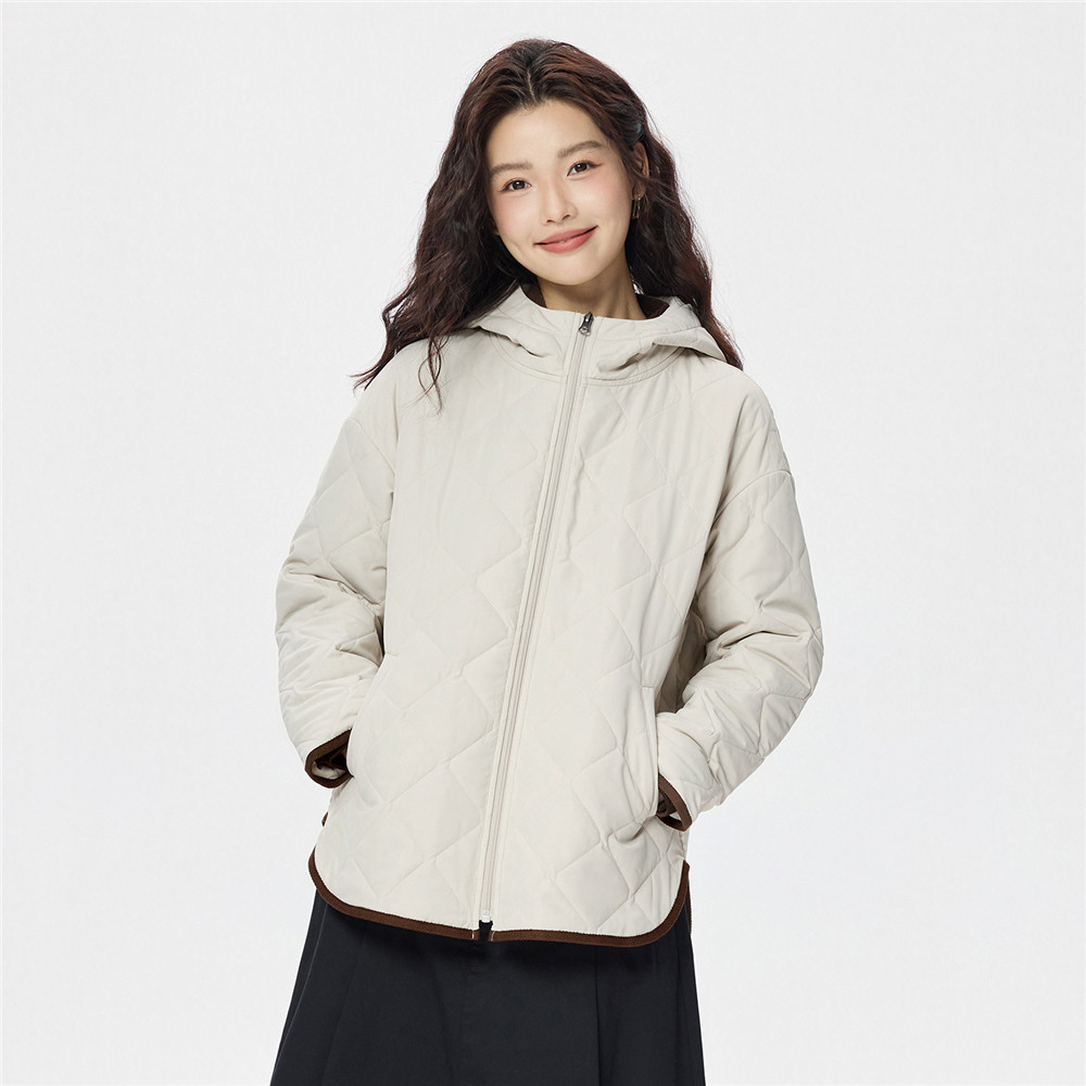 佐丹奴小香风棉衣外套女新款菱形格撞色包边连帽棉服夹克05375716