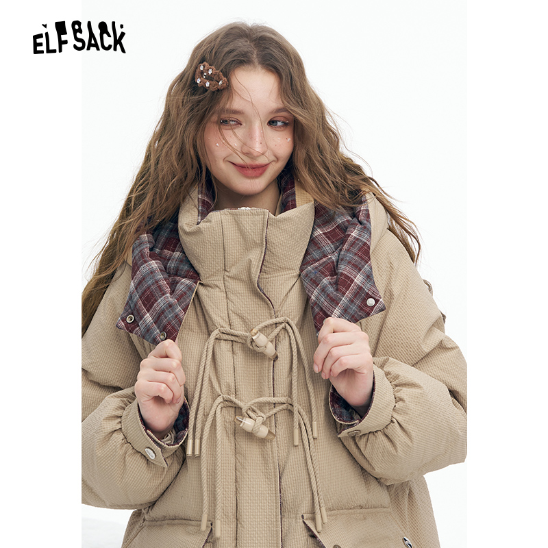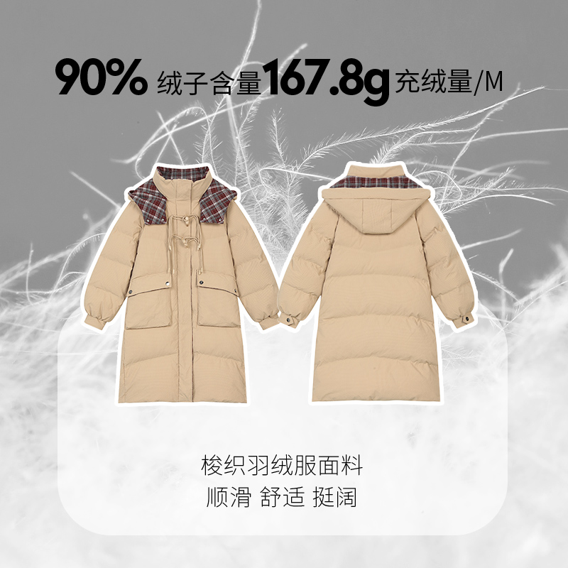 妖精的口袋复古格纹牛角扣连帽长款羽绒服女2025冬季新款保暖外套