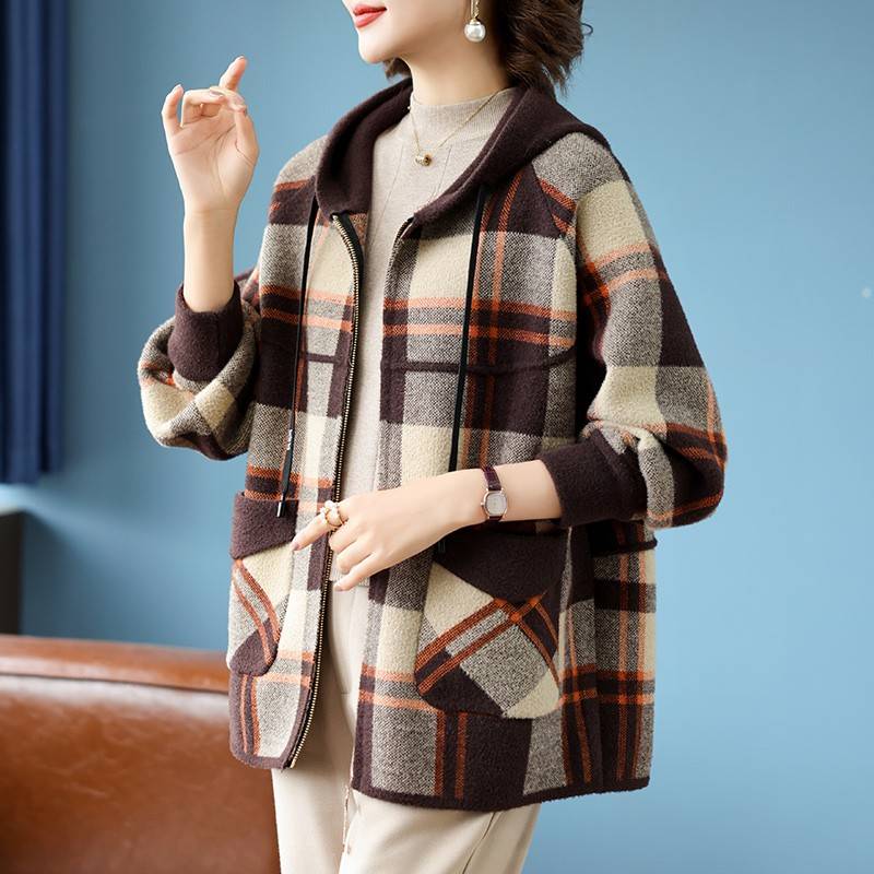 妈妈休闲针织短款外套中年女装春秋装2025新款中老年洋气连帽上衣