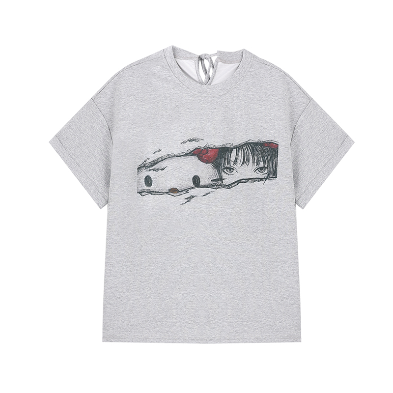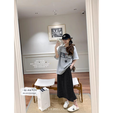 FF BLUE 富江KT 50棉酷感百搭休闲印花kitty短袖微凉感条纹半身裙