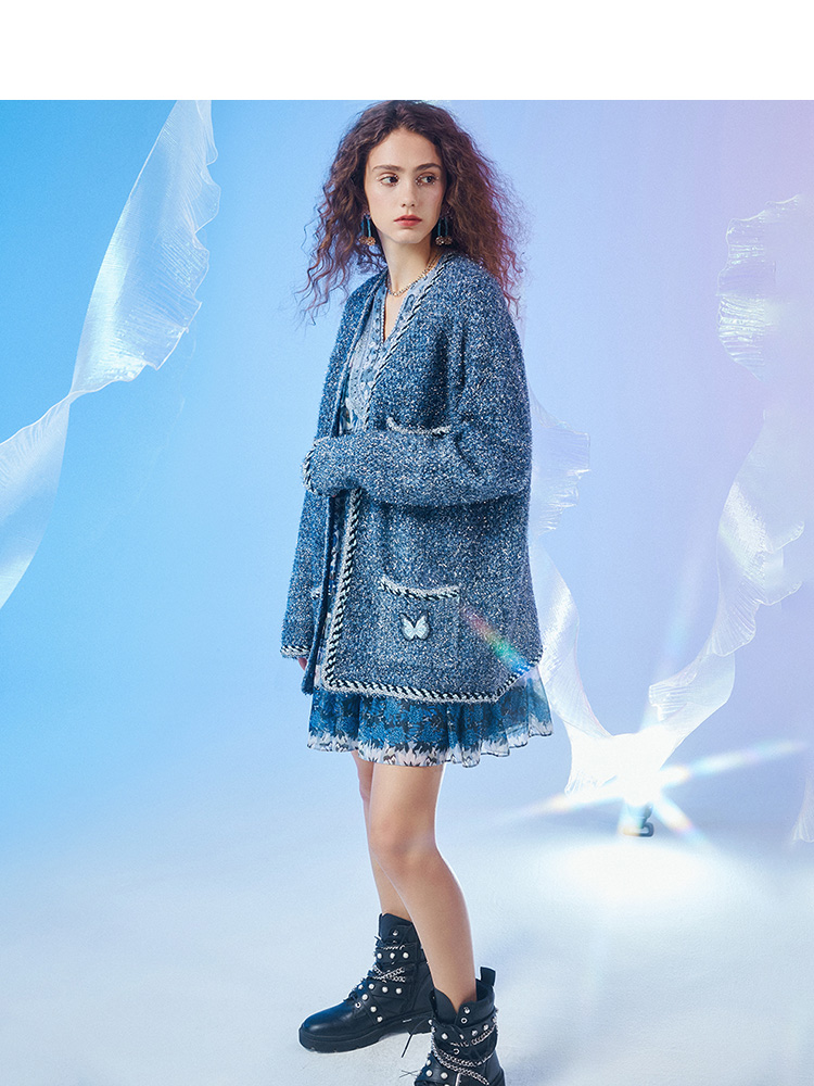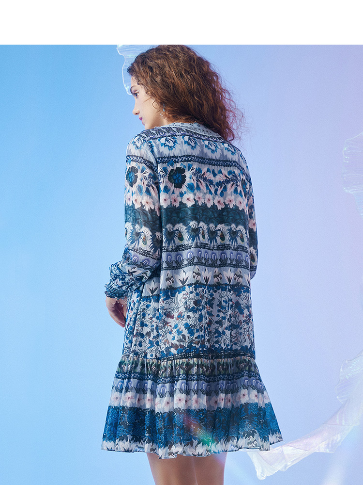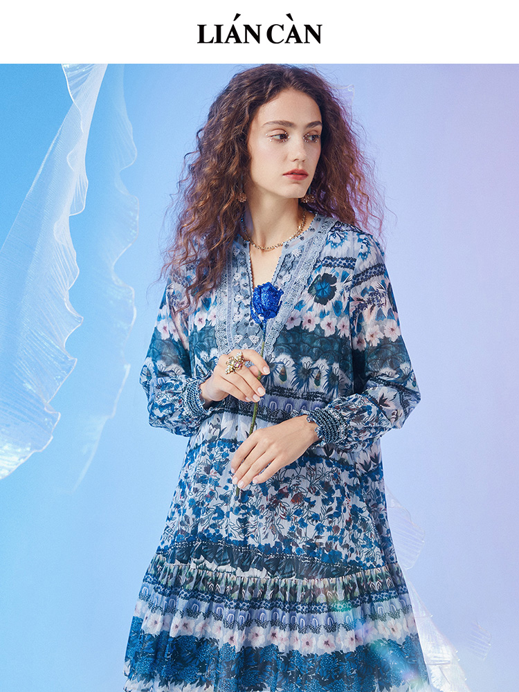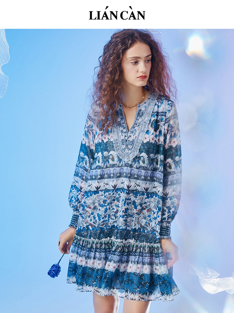 裂帛秋季新款商场同款宽松减龄A字国风印花雪纺长袖连衣裙
