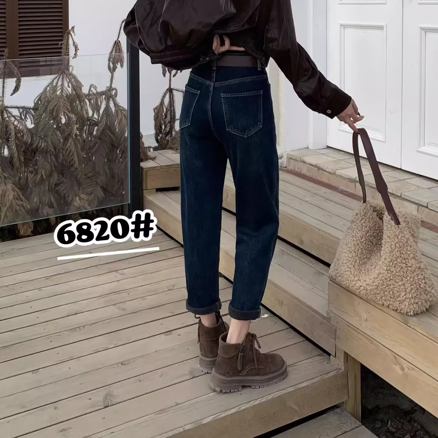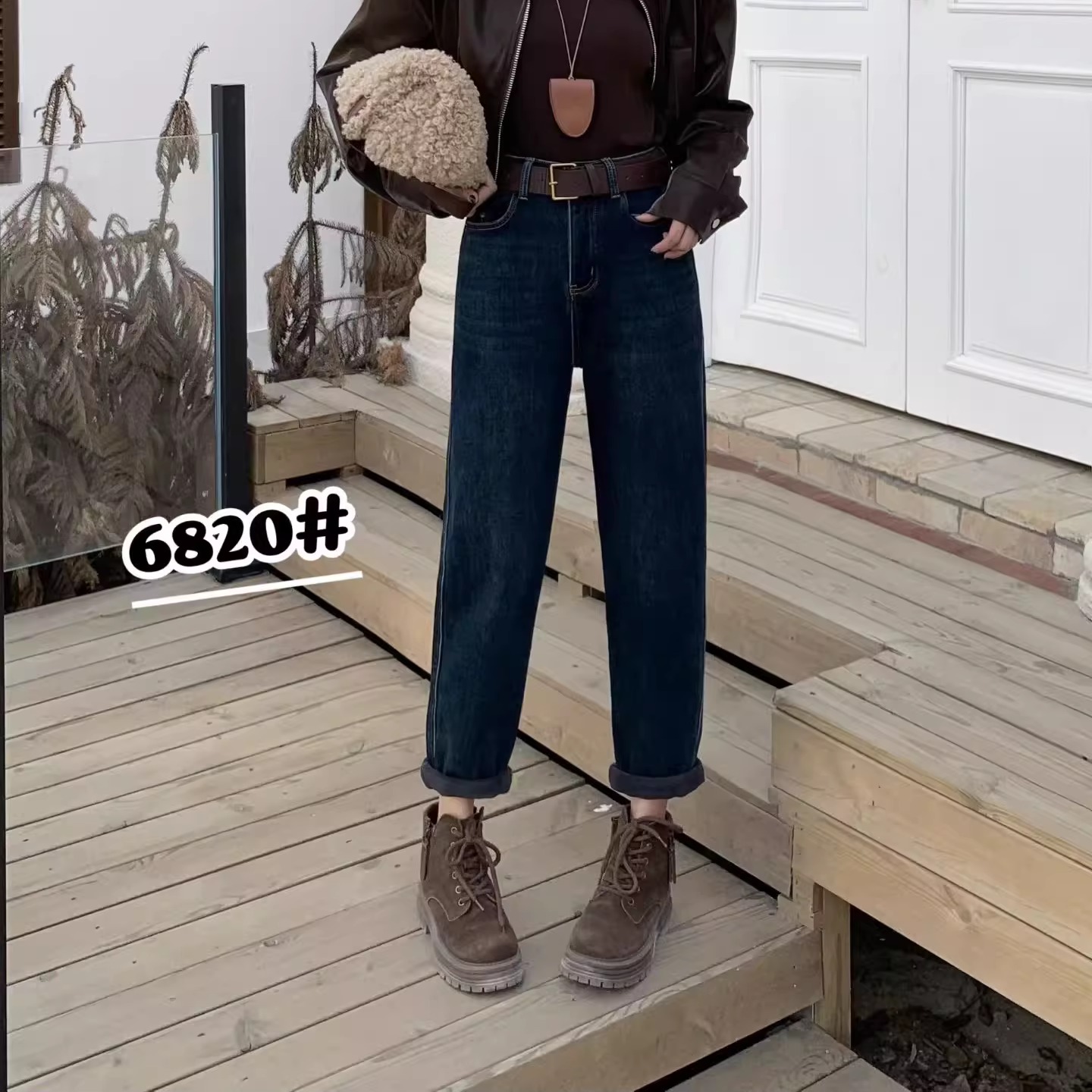 6820冬季时尚高腰加绒牛仔垮裤显瘦弹力婴儿绒萝卜裤加大码老爹裤