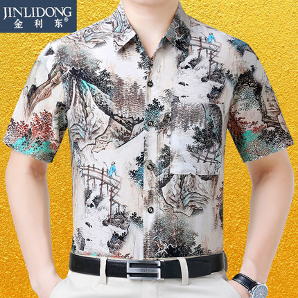 夏季男士短袖衬衫桑蚕丝中老年男宽松时尚休闲丝光棉亚麻印花衬衣