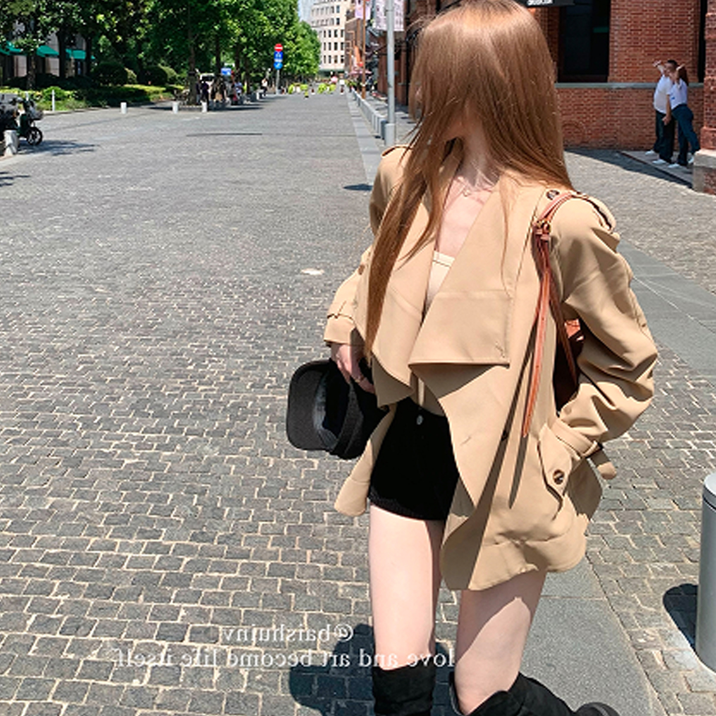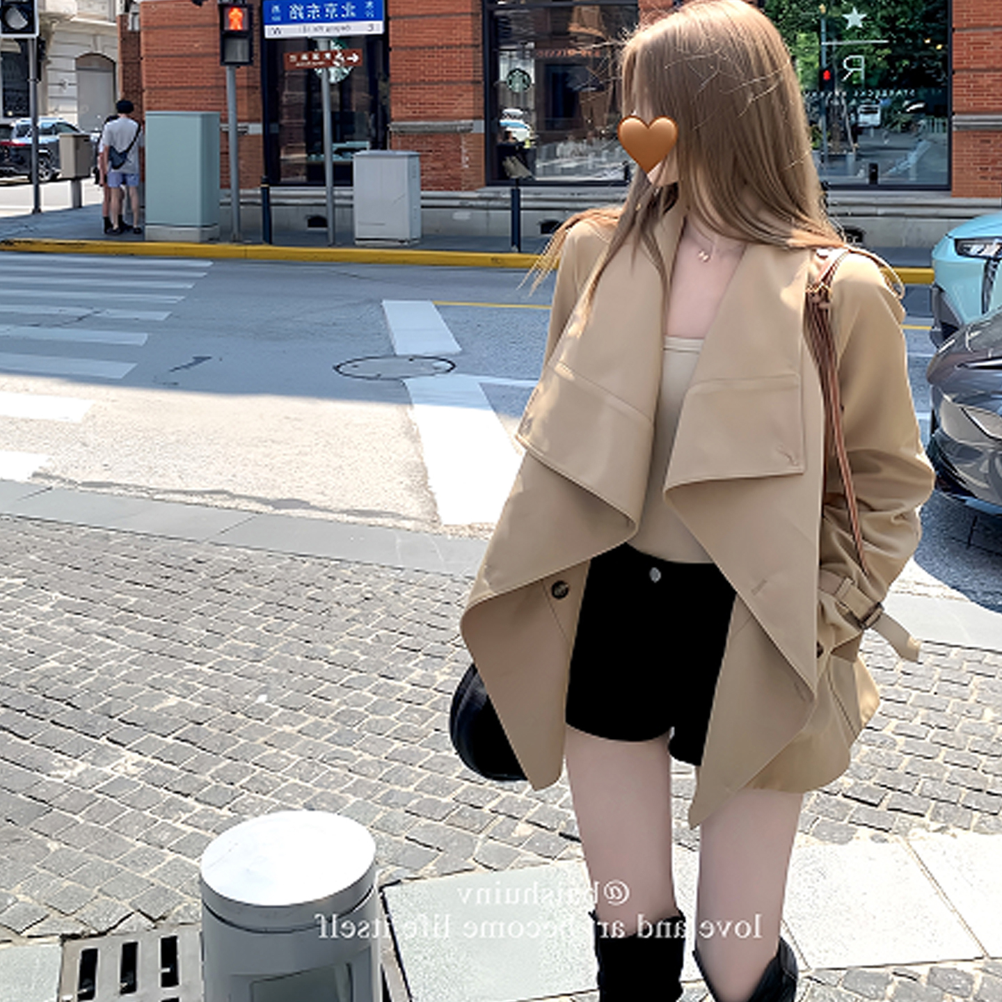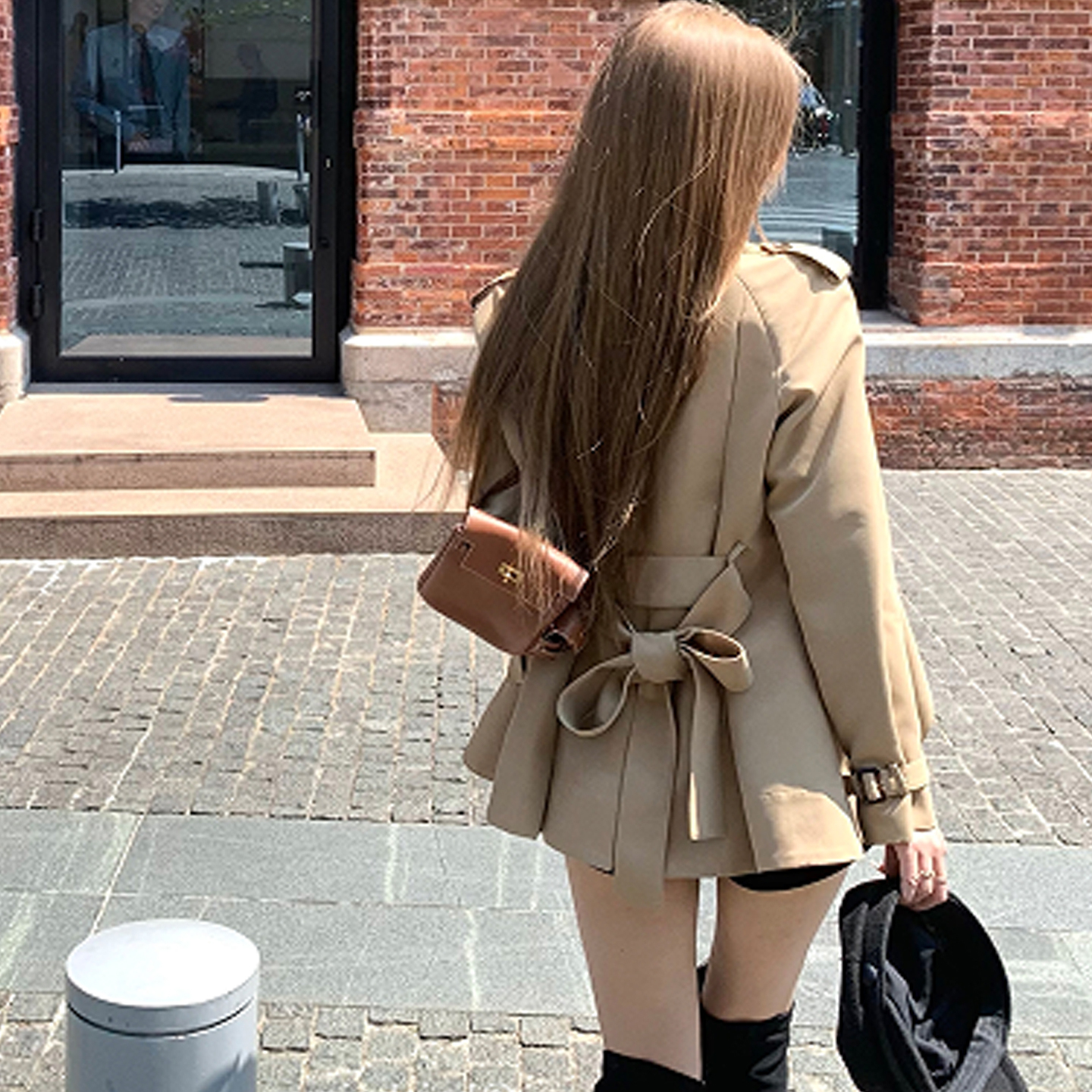 卡其色短款风衣外套女春秋新款韩系后背蝴蝶结系带小个子宽松大衣