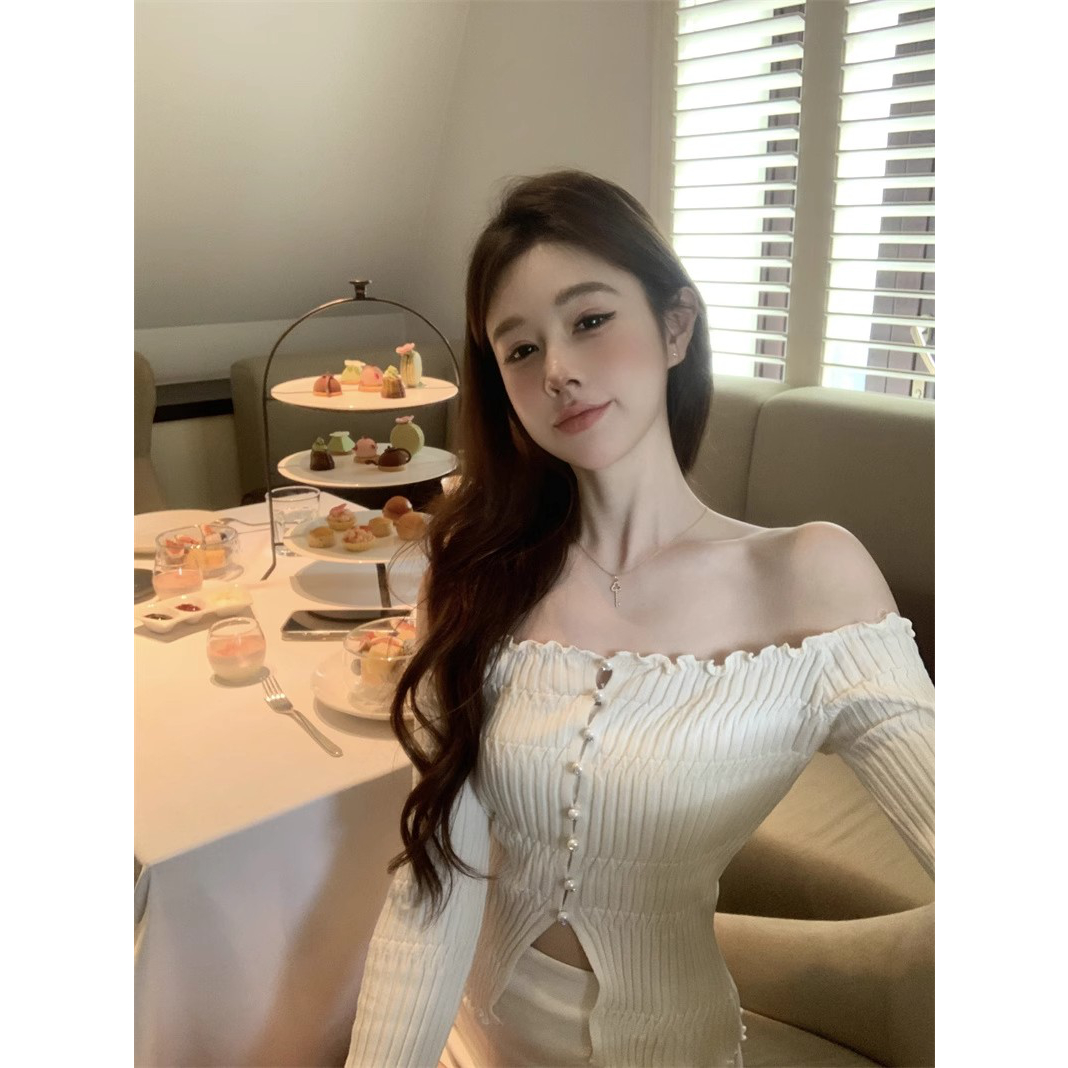 白色一字肩长袖针织衫女秋季纯欲风收腰修身毛衣镂空短款露肩上衣