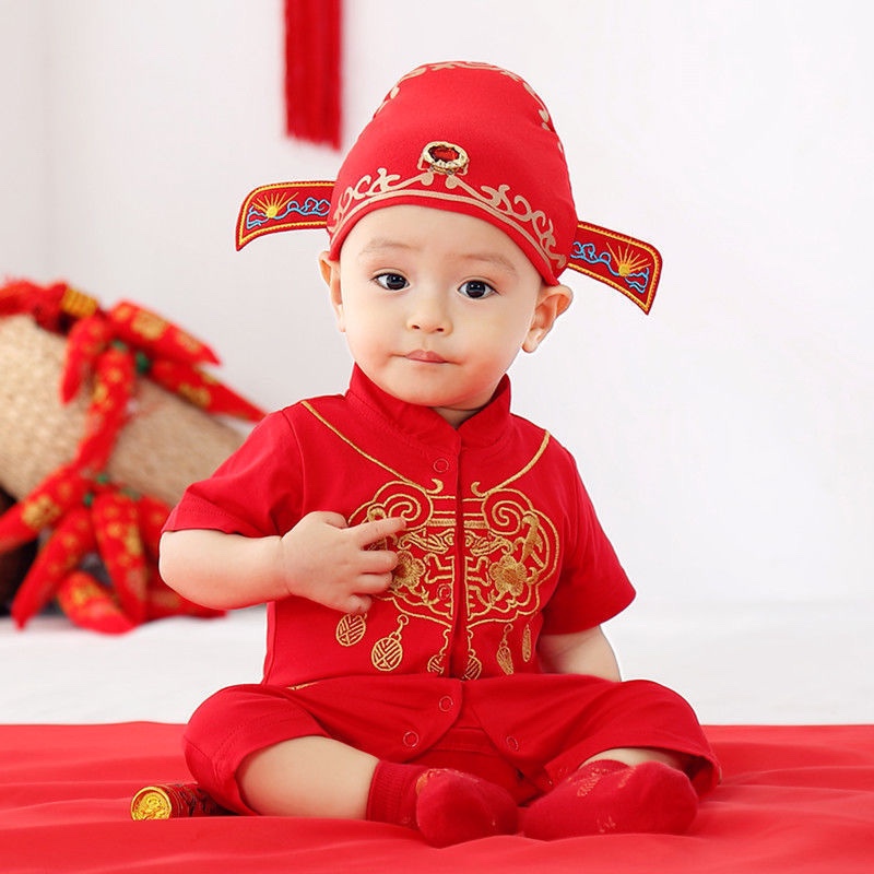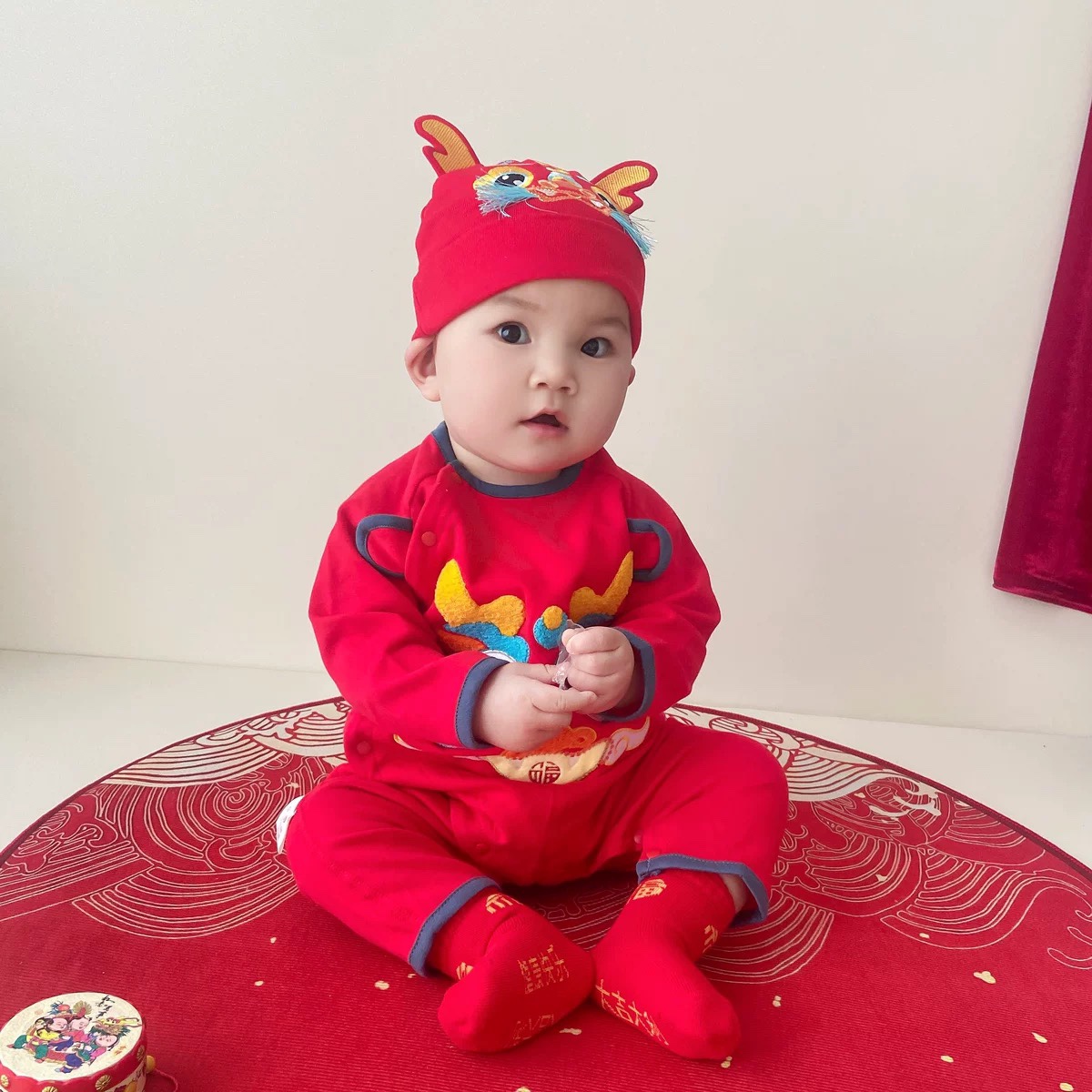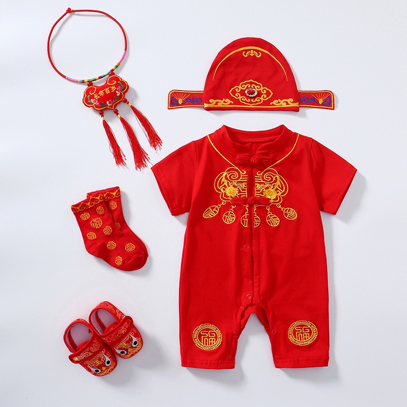 婴儿百天衣服中式连体衣春夏蛇年宝宝周岁服红色满月礼新生儿纯棉