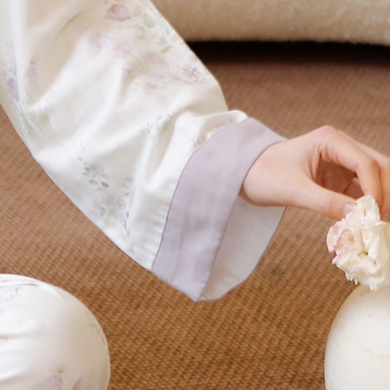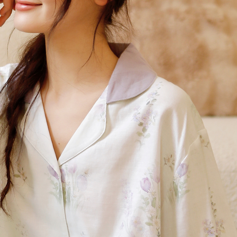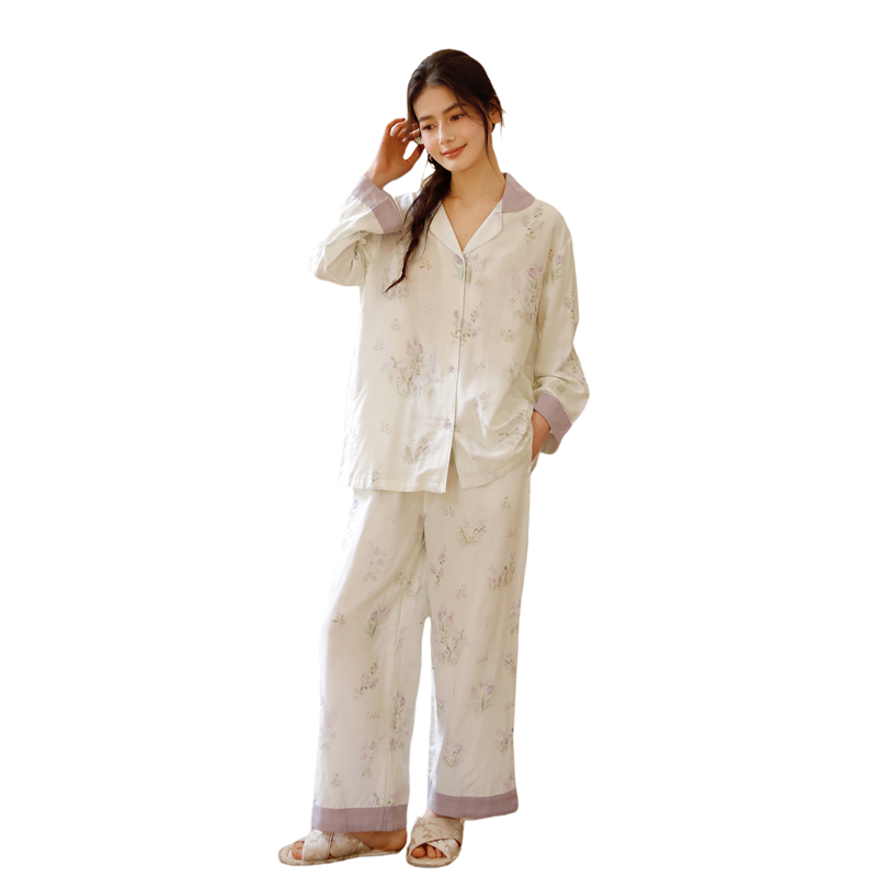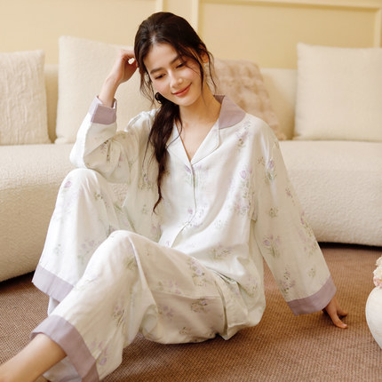 翻领全棉双层纱布睡衣女士印花长袖长裤舒适休闲居家春季时尚套装