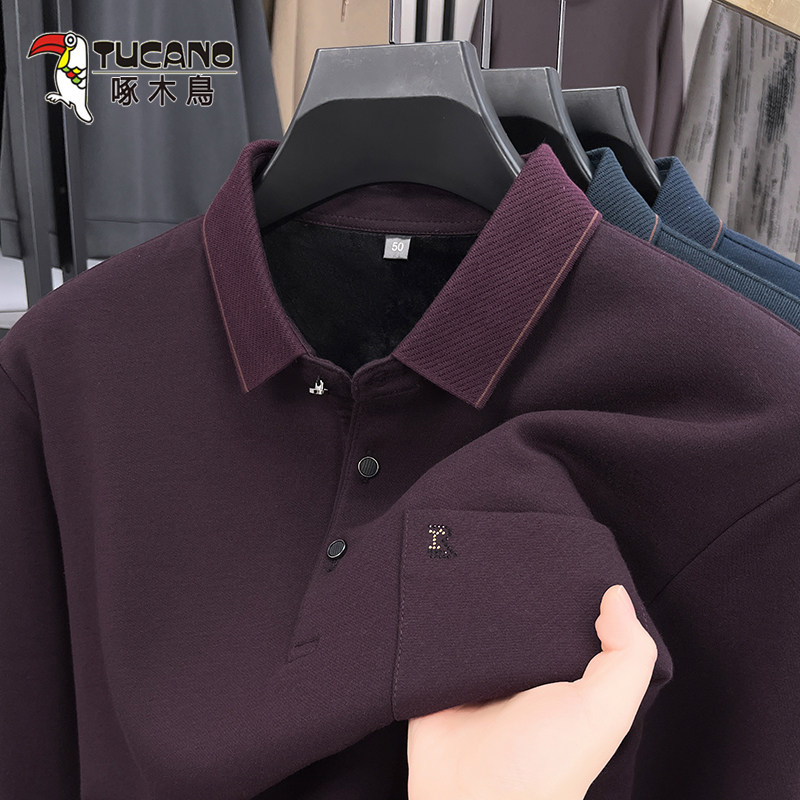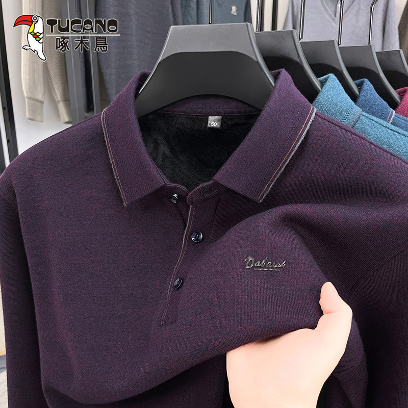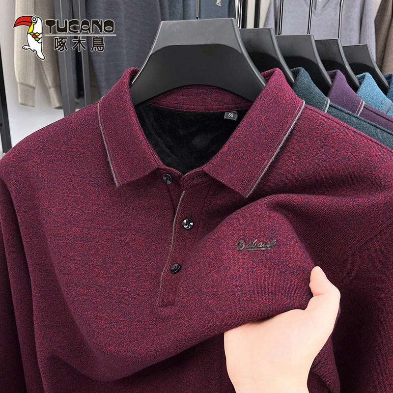 啄木鸟高品质羊毛布加绒t恤男士秋冬新款加厚保暖翻领打底POLO衫