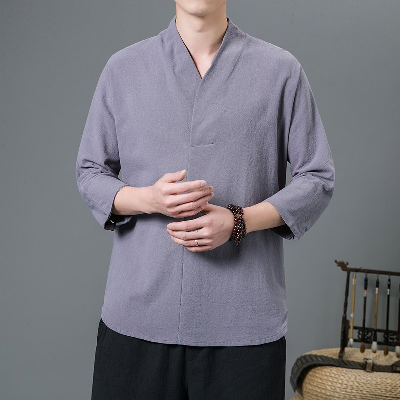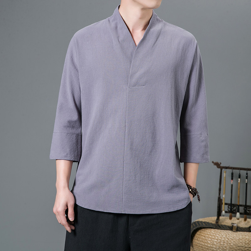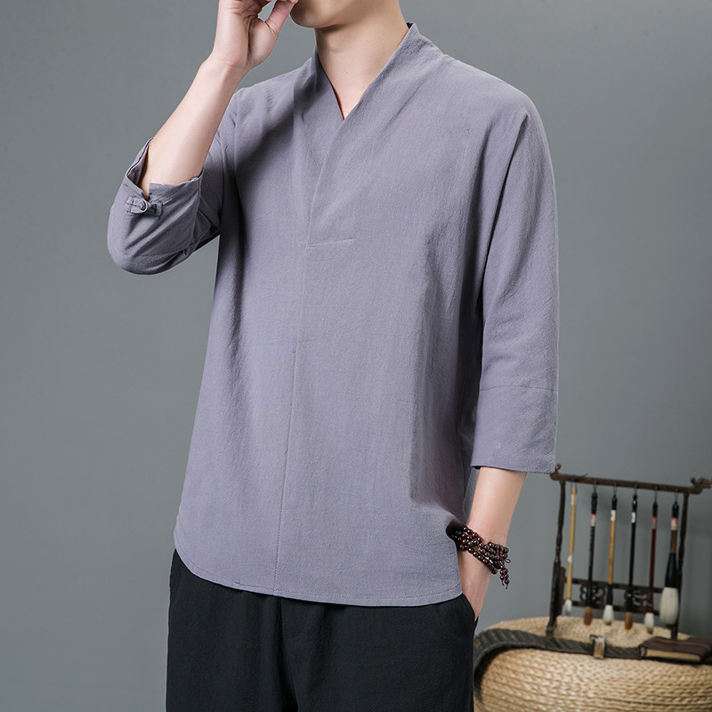 亚麻t恤男纯色v领棉麻打底衫中国风潮流复古七分袖纯色百搭上衣服