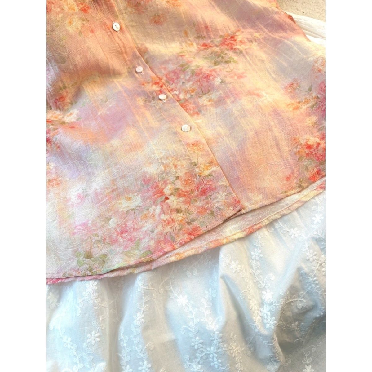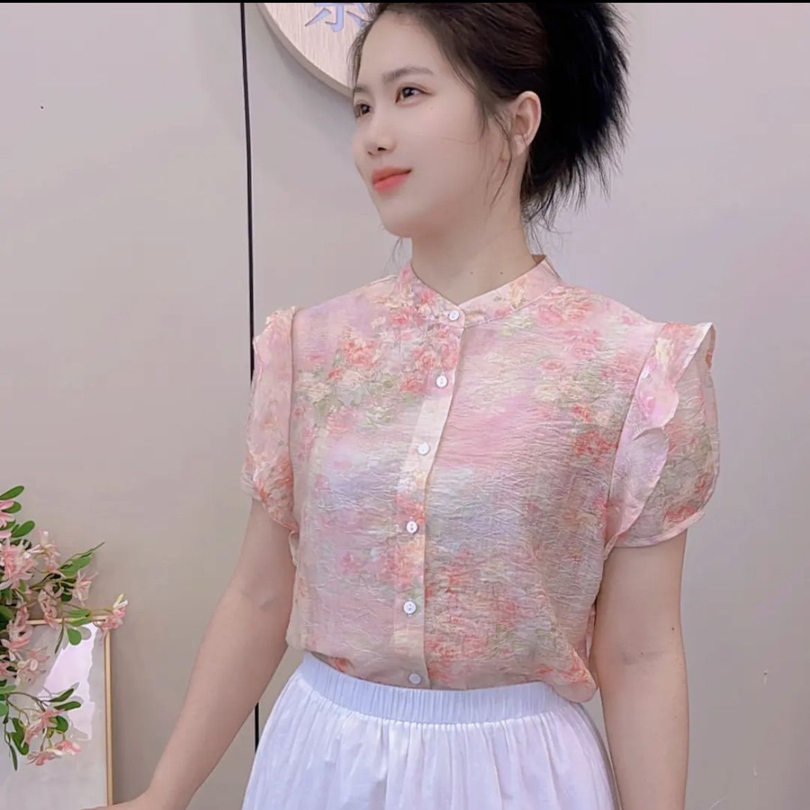 衬衫女2025新款时尚韩版荷叶边宽松遮肚子温柔风粉色印花短袖上衣
